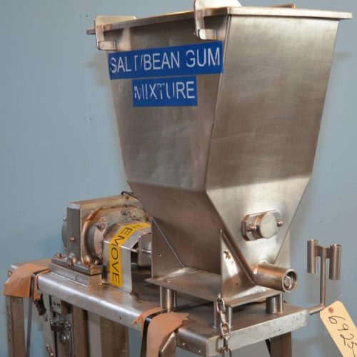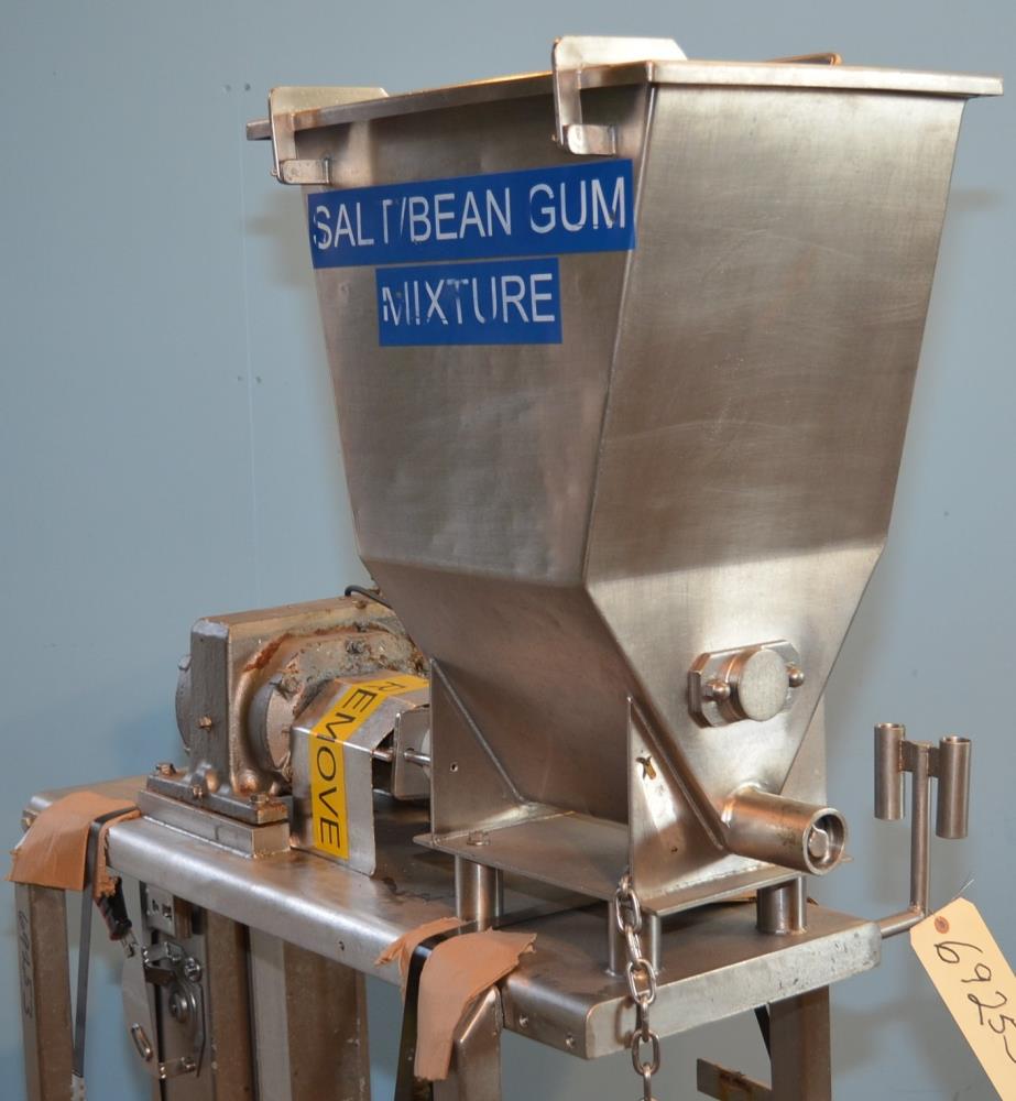 Stainless Steel Ingredient Feeder on Stainless Steel Stand, 1 1/2 in Dia Screw, Hopper Dims: 15 1/2 in L x 12 in W x 20 in Deep, Hinged Cover, 41 in Discharge Height, 3/4 HP 1725 RPM Drive, Output Approx 12 RPM. 230/460V (Connected 460V), 3 Ph, 60 Hz.