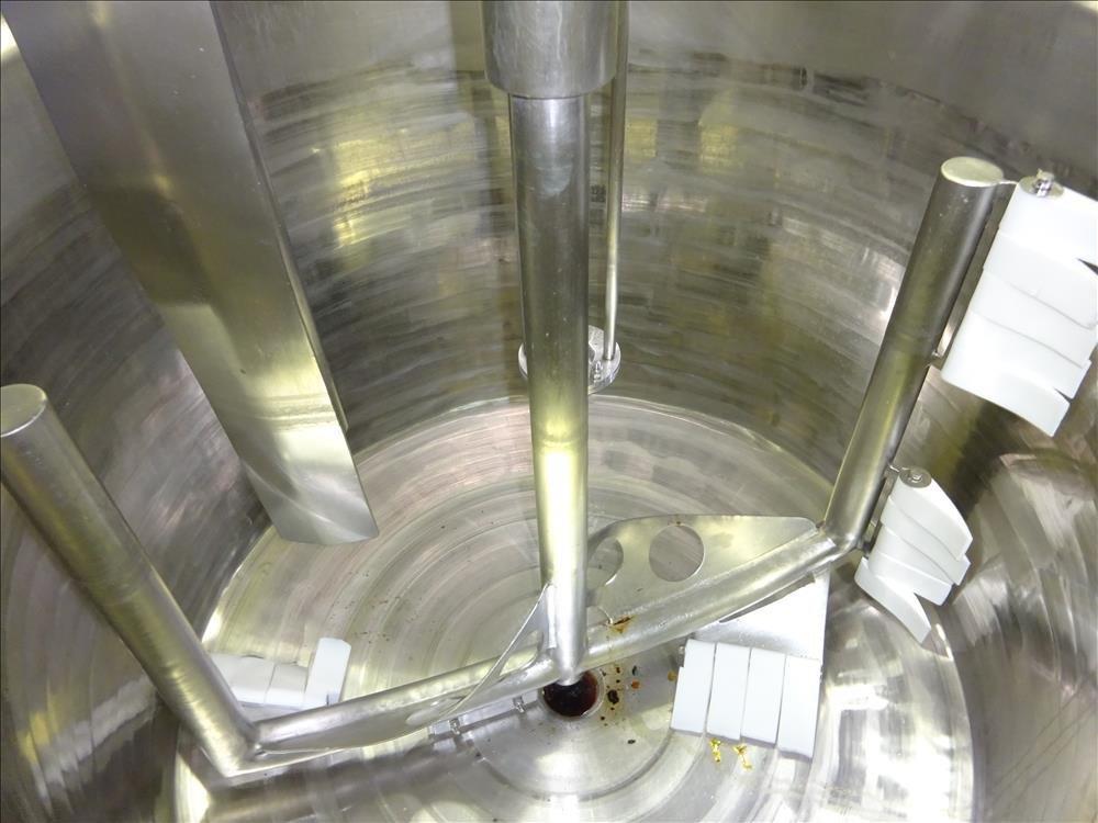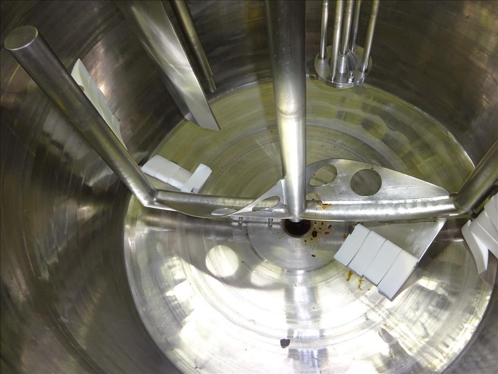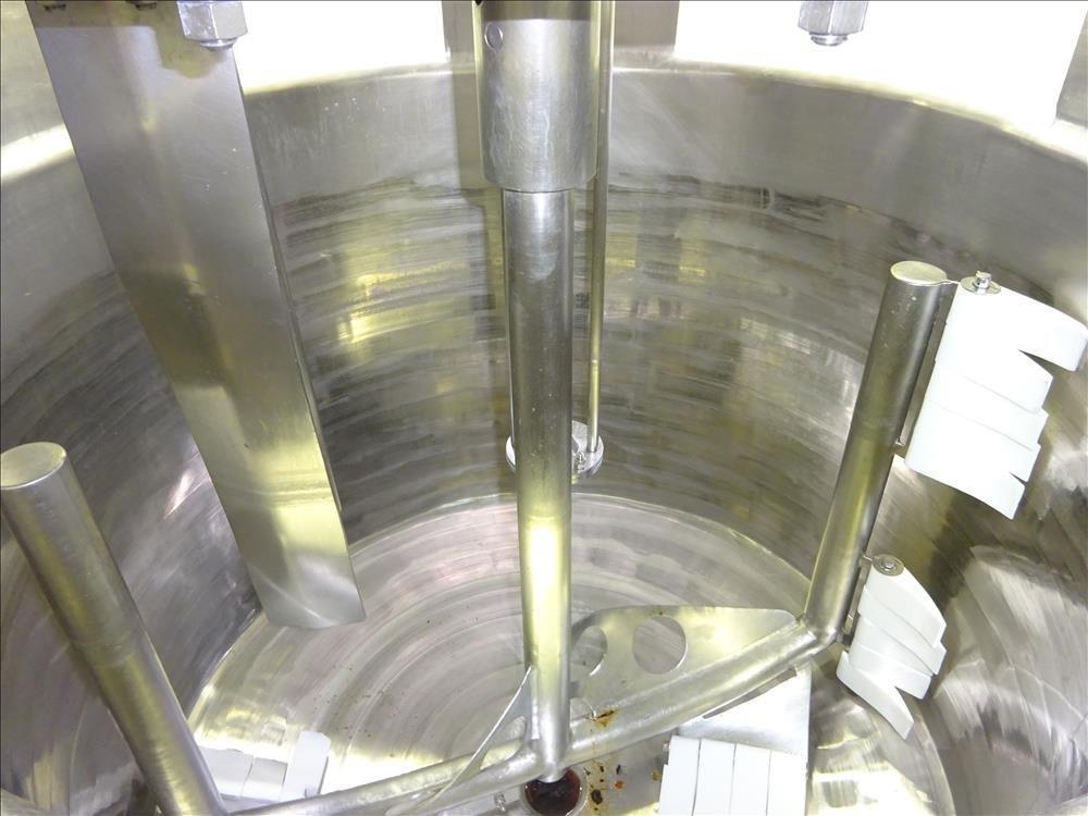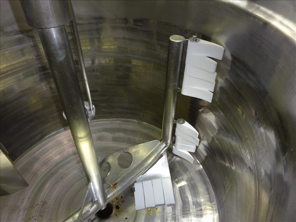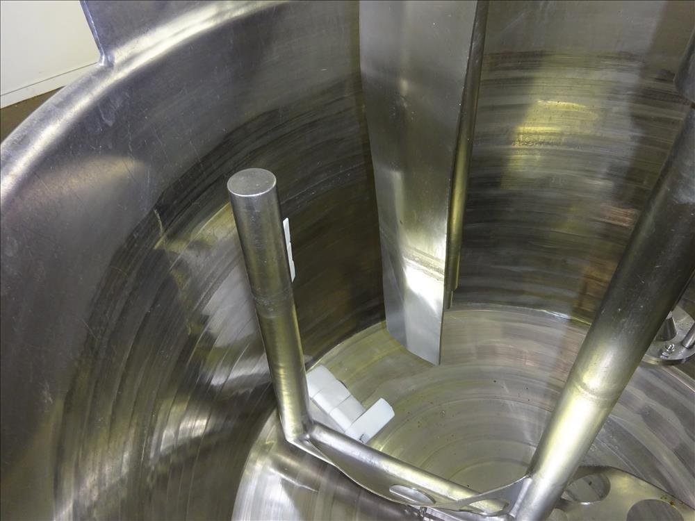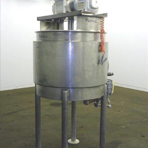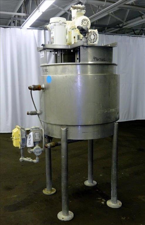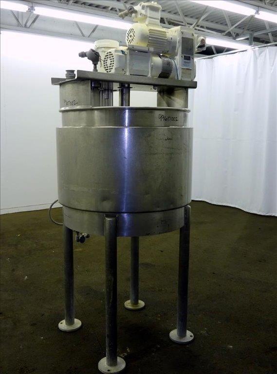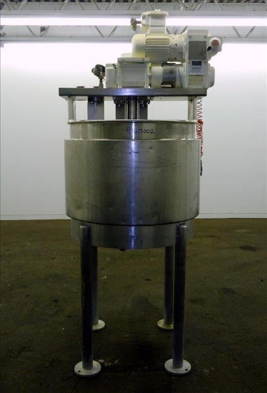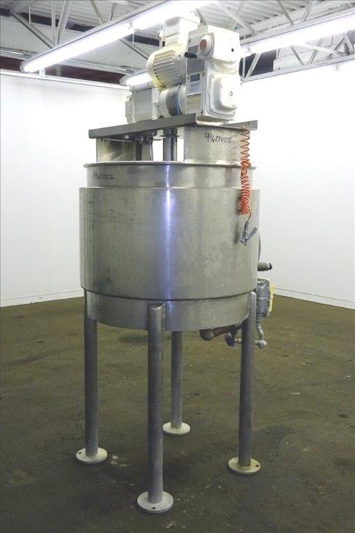 100 Gallon S/S Vertical Jacketed Dual Agitated Kettle. Approximate 34 in diameter x 24 in straight side. Open top with 3 piece cover, slight dished bottom, jacketed (no rating). Bolt on agitator bridge with an sweep scrap agitator with side and bottom scrapers, driven by a 1.5 hp, 3/60/460 volt, 1720 rpm XP variable speed motor. (1) Off center top entering Silverson high shear batch mixer, model BX60, serial# 2CB2482, driven by a 2 hp, 3/60/230/460 volt, 3450 rpm XP motor. Approximate 2 in center bottom outlet, mounted on 4 stainless steel legs.