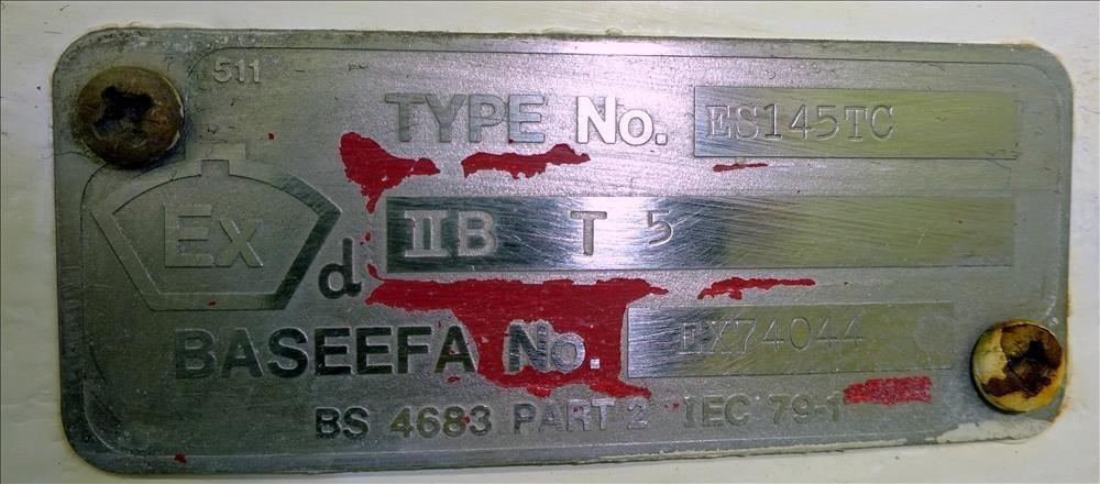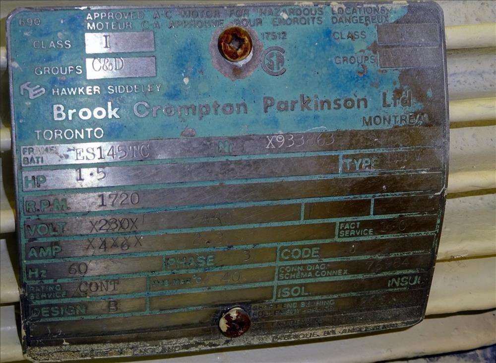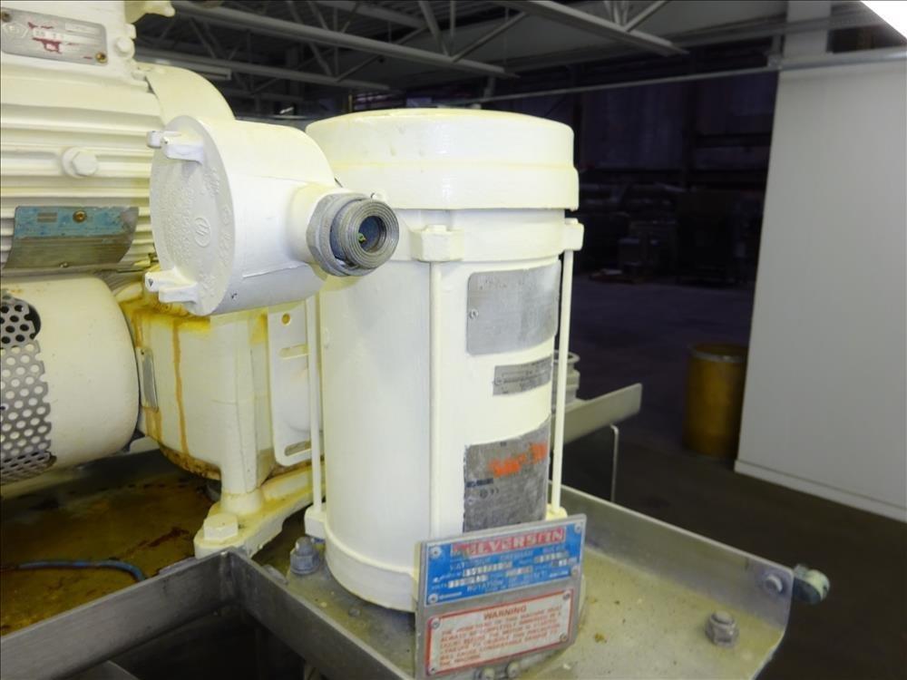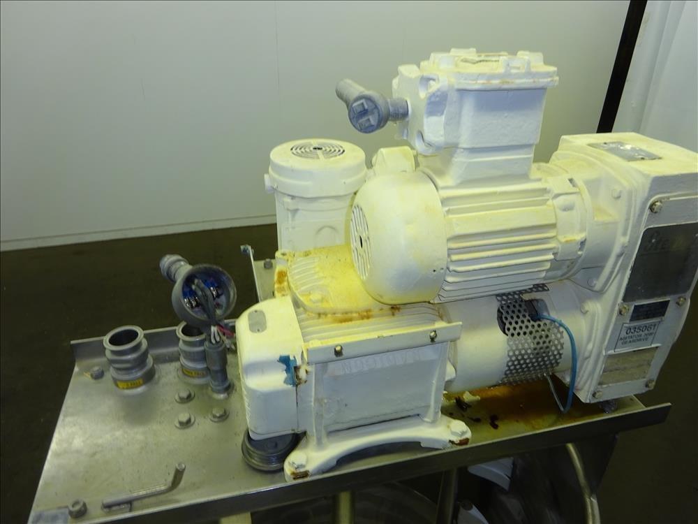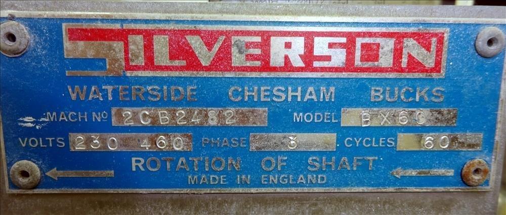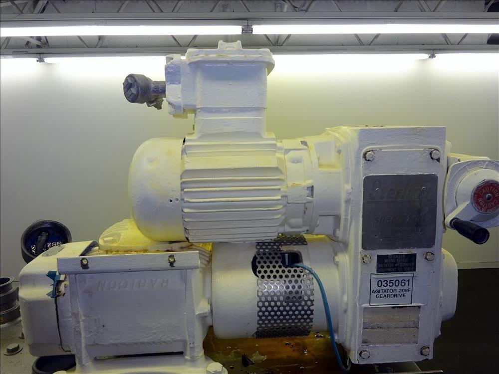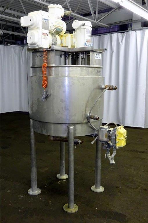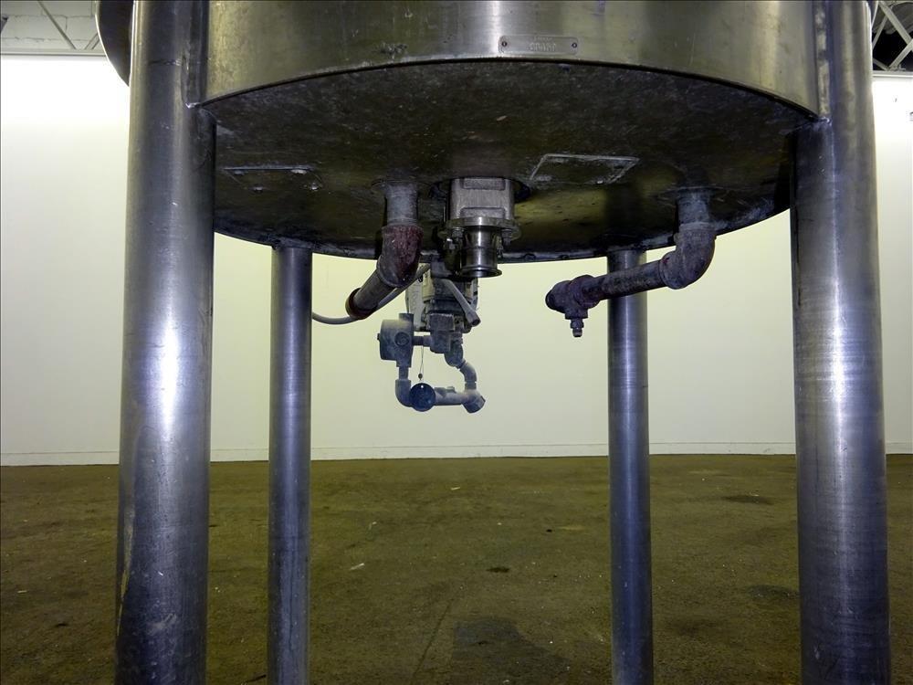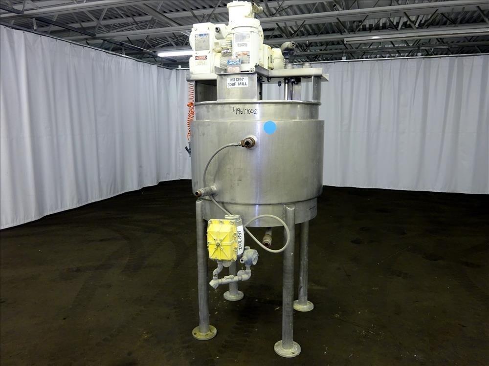 100 Gallon S/S Vertical Jacketed Dual Agitated Kettle. Approximate 34 in diameter x 24 in straight side. Open top with 3 piece cover, slight dished bottom, jacketed (no rating). Bolt on agitator bridge with an sweep scrap agitator with side and bottom scrapers, driven by a 1.5 hp, 3/60/460 volt, 1720 rpm XP variable speed motor. (1) Off center top entering Silverson high shear batch mixer, model BX60, serial# 2CB2482, driven by a 2 hp, 3/60/230/460 volt, 3450 rpm XP motor. Approximate 2 in center bottom outlet, mounted on 4 stainless steel legs.