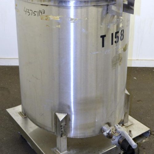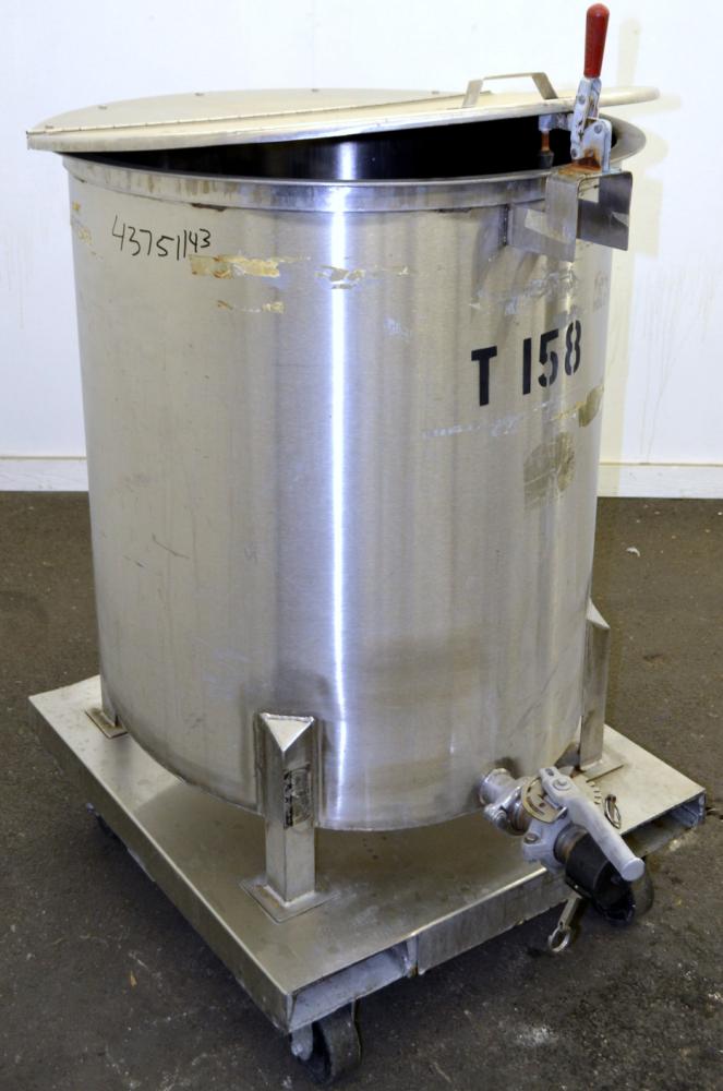 100 Gallon Water Cooling Corporation Vertical S/S Single Wall Tank, Approximate 31 in diameter x 34 in straight side. Flat top with a bolt on hinged cover, 6 in sloped bottom. 2 in Tri-clamp side bottom outlet. Mounted on 4 stainless steel legs on a carbon steel, and stainless steel forklift base with casters.
