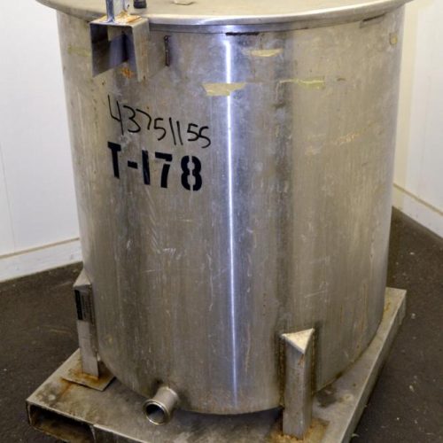 100 Gallon Water Cooling Corporation Vertical S/S Single Wall Tank, Approximate 31 in diameter x 34 in straight side. Flat top with a bolt on hinged cover, 6 in sloped bottom. 2 in Tri-clamp side bottom outlet. Mounted on 4 stainless steel legs on a carbon steel, and stainless steel forklift base with casters.