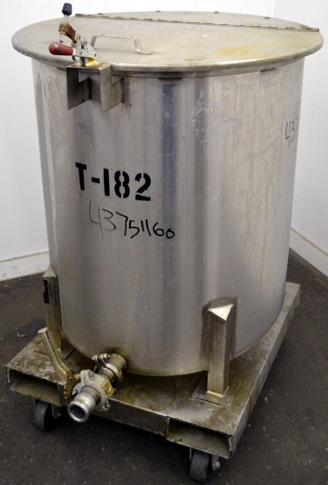 100 Gallon Water Cooling Corporation Vertical S/S Single Wall Tank, Approximate 31 in diameter x 34 in straight side. Flat top with a bolt on hinged cover, 6 in sloped bottom. 2 in Tri-clamp side bottom outlet. Mounted on 4 stainless steel legs on a carbon steel, and stainless steel forklift base with casters.