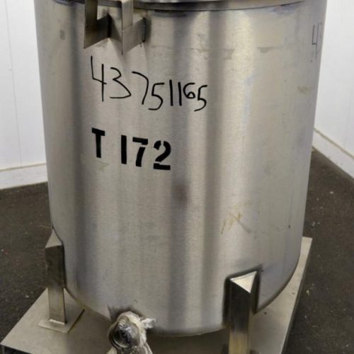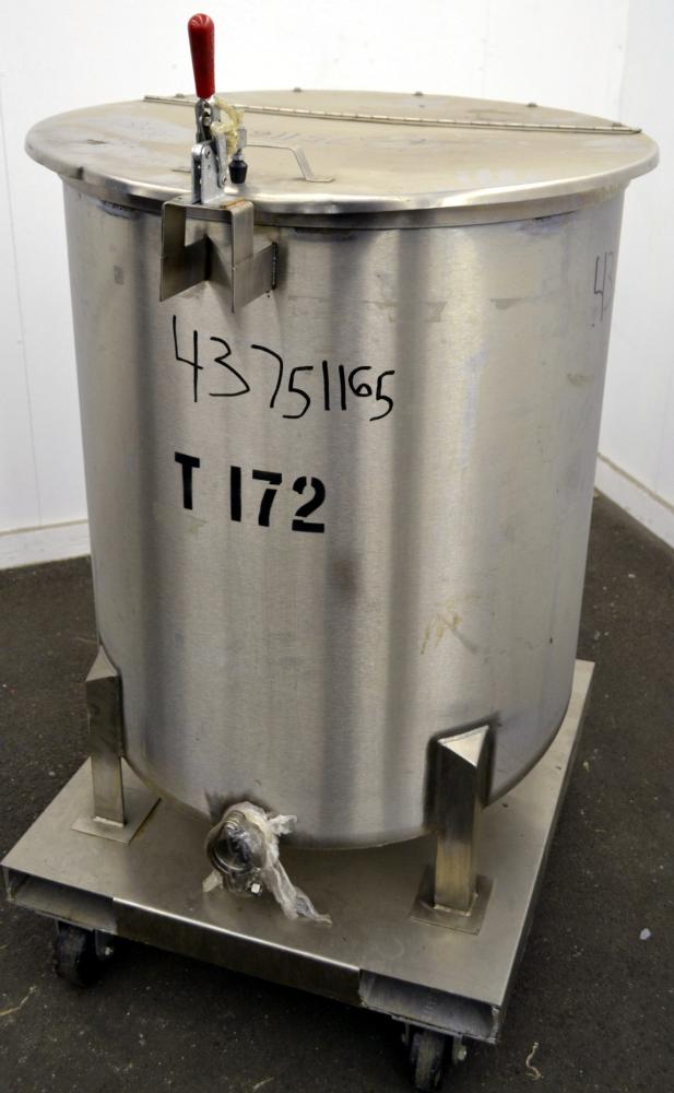 100 Gallon Water Cooling Corporation Vertical S/S Single Wall Tank, Approximate 31 in diameter x 34 in straight side. Flat top with a bolt on hinged cover, 6 in sloped bottom. 2 in Tri-clamp side bottom outlet. Mounted on 4 stainless steel legs on a carbon steel, and stainless steel forklift base with casters.