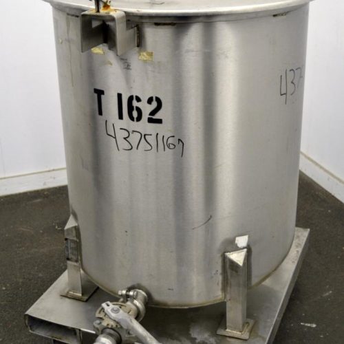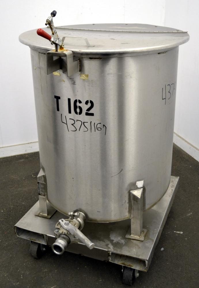 100 Gallon Water Cooling Corporation Vertical S/S Single Wall Tank, Approximate 31 in diameter x 34 in straight side. Flat top with a bolt on hinged cover, 6 in sloped bottom. 2 in Tri-clamp side bottom outlet. Mounted on 4 stainless steel legs on a carbon steel, and stainless steel forklift base with casters.