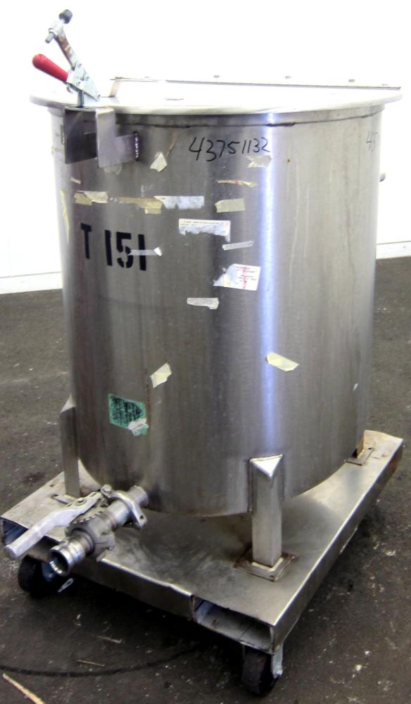 100 Gallon Water Cooling Corporation Vertical S/S Single Wall Tank, Approximate 31 in diameter x 34 in straight side. Flat top with a bolt on hinged cover, 6 in sloped bottom. 2 in Tri-clamp side bottom outlet. Mounted on 4 stainless steel legs on a carbon steel, and stainless steel forklift base with casters.