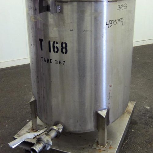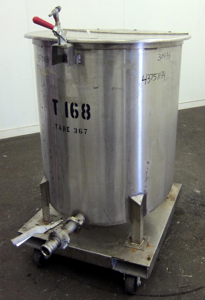 100 Gallon Water Cooling Corporation Vertical S/S Single Wall Tank, Approximate 31 in diameter x 34 in straight side. Flat top with a bolt on hinged cover, 6 in sloped bottom. 2 in Tri-clamp side bottom outlet. Mounted on 4 stainless steel legs on a carbon steel, and stainless steel forklift base with casters.