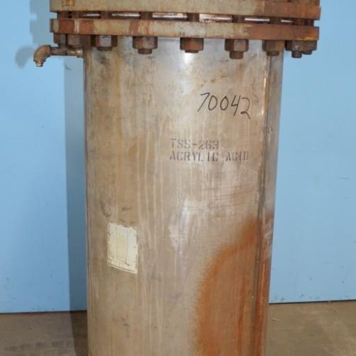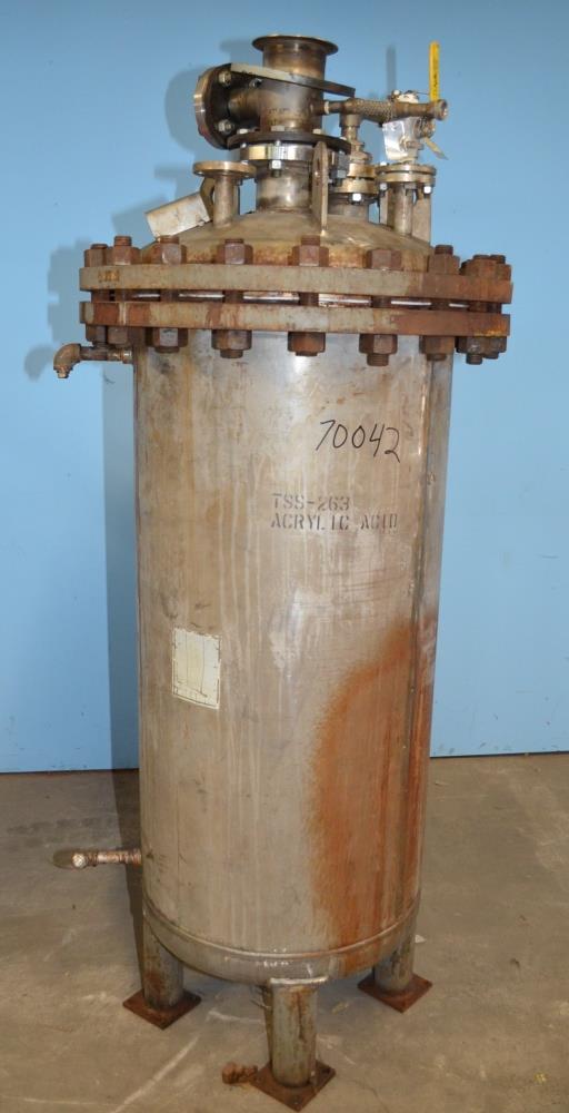 100 Gallon Whiting Metals 304 S/S Vertical Pressure Tank. 24 in diameter x 48 in straight side, dished bolt on top, dished bottom. Internal rated Full Vacuum and 45 PSI at 200 degrees F. Openings top 1-1/2 in, 1 in, 4 in, 1-1/2 in NPT, side (2) approximate 1-1/4 in NPT. Approximate 1 in NPT center bottom outlet. Mounted on (4) carbon steel legs. National Board# 891.