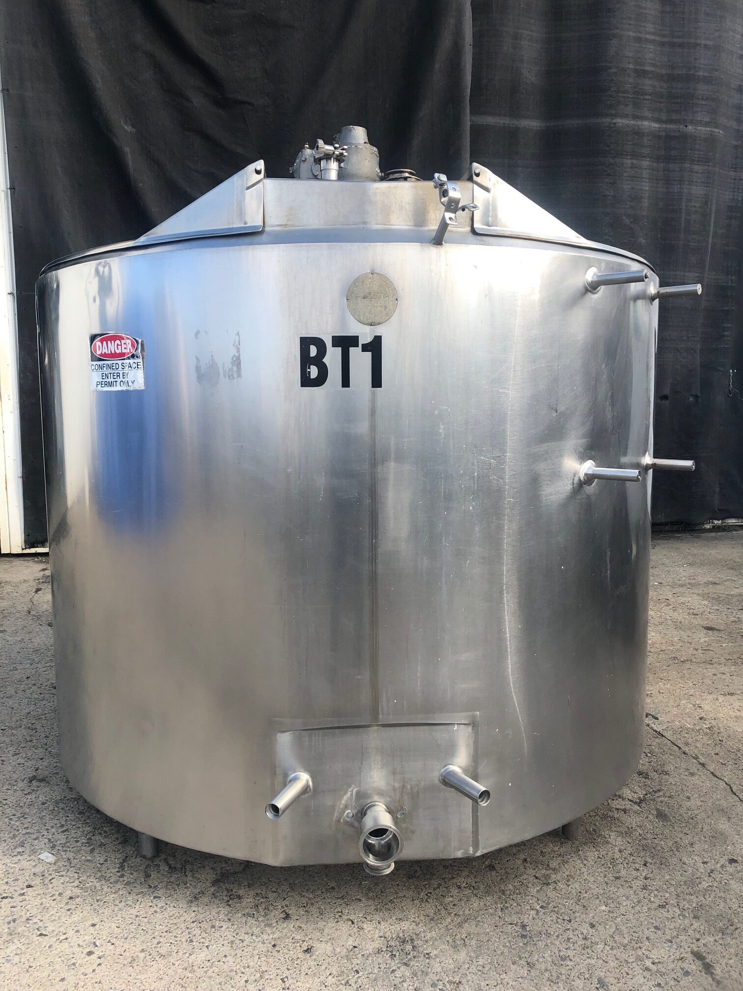 1,000 Gallon APV Crepaco Vertical Stainless Steel Dome Top, Cone Bottom Pressure Wall Processor, Side Scrape and Wide Bottom Sweep Agitation, Top Manway, 2.5 in Outlet, Thermowell, Level Sensor, Stainless Steel Legs W/ Feet, Approx. 82 in Dia x 132 in H.