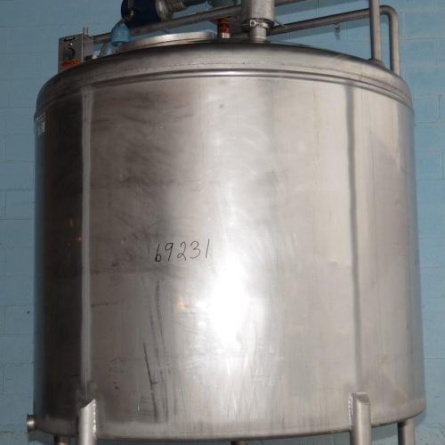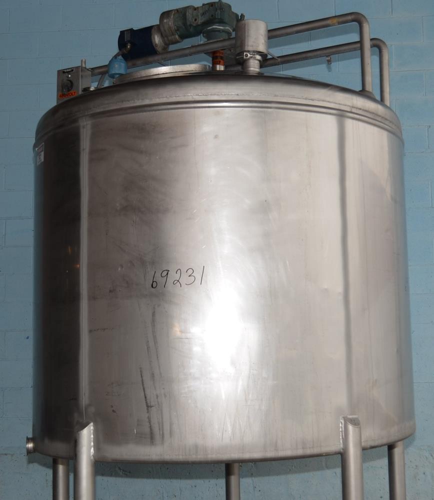 1,000 Gallon Mueller Stainless Steel Single Wall Vertical Sweep Agitated Tank. 76 in Inside Diameter x 56 in Straight Side, Dome Top 12 in Deep, Top Inlets: (1) 2 1/2 in Clamp Style, (2) 3 in Clamp Style, Temp Probe, (2) CIP Spray Balls, 3 in Side Bottom Clamp Style Discharge, 47 in Discharge Height w/ S/S Legs, Concave Bottom with Slight Slope, Top Mounted Sweep Agitator, 1 HP Drive with 22 Final RPM, Gear Box Ratio 40:1, 3/230/460/60, 3.6/3.3/1.9 Amp, Wired 460V.
