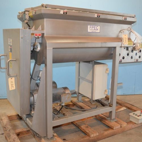 FPEC Model 814 1,000 Pounds (Approx 35 Cu Ft) S/S Dual Shaft Ribbon Blender. 60 in L x 37.5 in W x 27.5 in D Interior Trough Dimensions, Twin 14 in W x 7 in H End Door Discharge with Pneumatic Operated Doors, Open Top with (2) Hinged Dump Grates, 1 1/2 in W x 1/2 in Thick Ribbons with 1 1/4 in Diameter Posts, 4 in Diameter Shafts, 38 in Discharge Height, Safety Switch on Top Grates. Two 7.5 HP Drives, 230/460 V (wired 460V), 3 Ph, 60 Hz, 1720 RPM, 18.8/9.4 Amp, Gear Box Ratio 23.40.