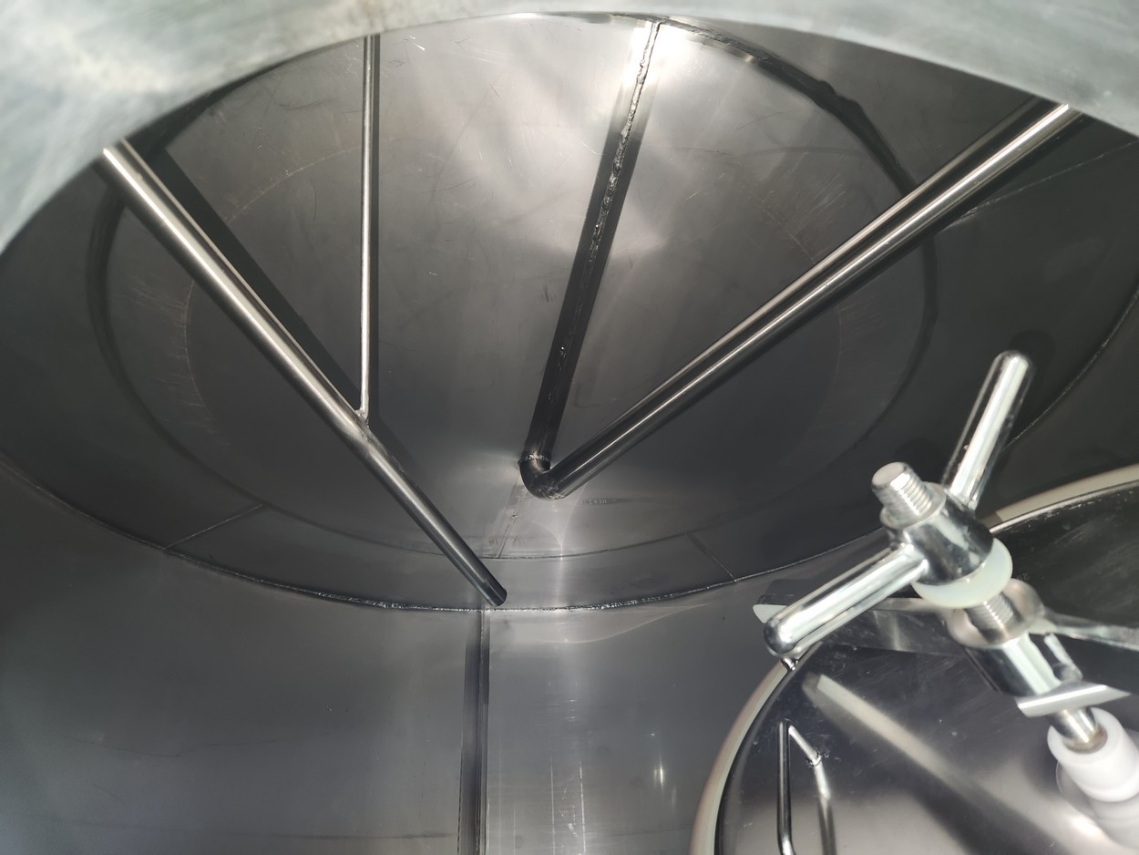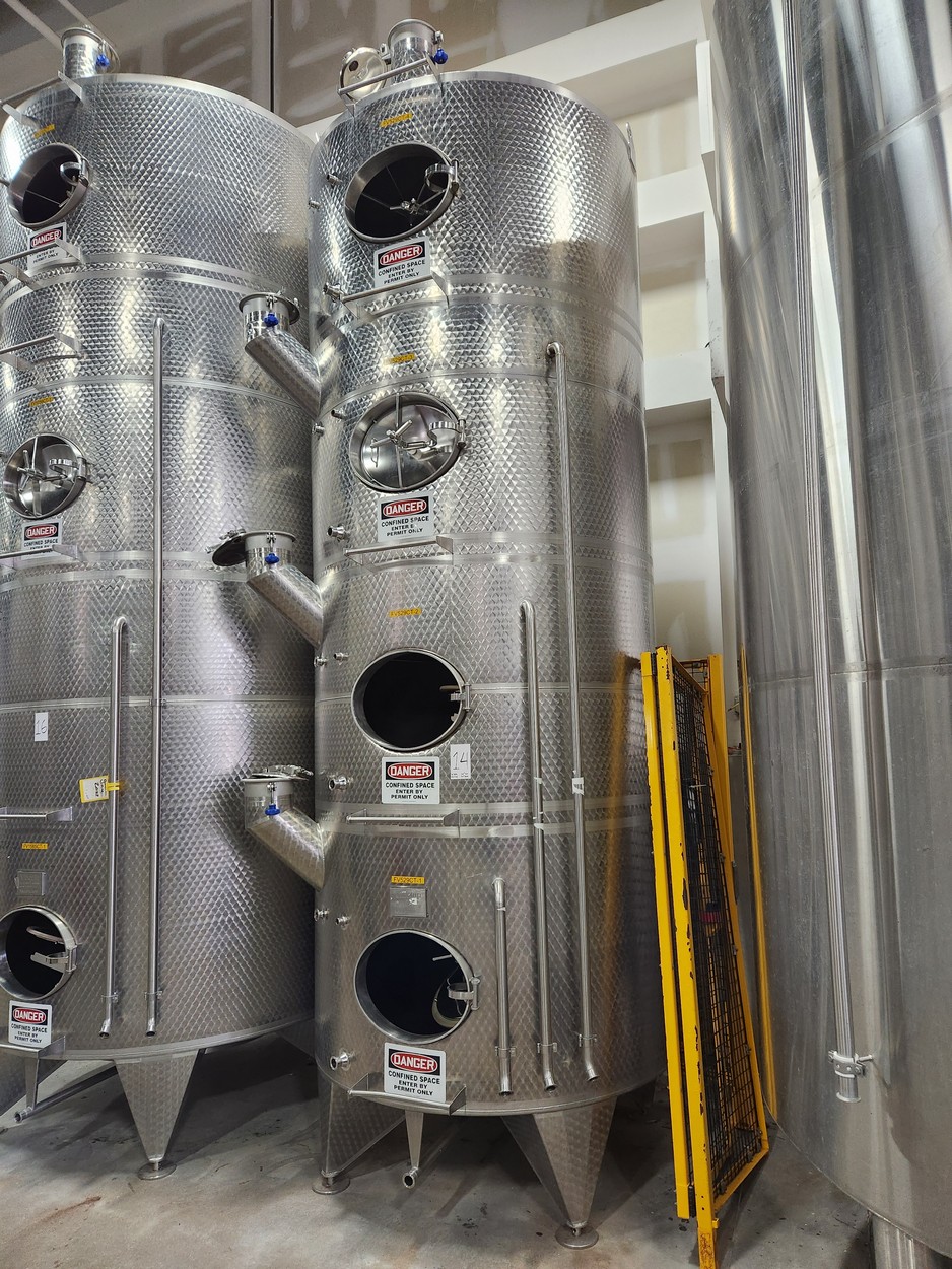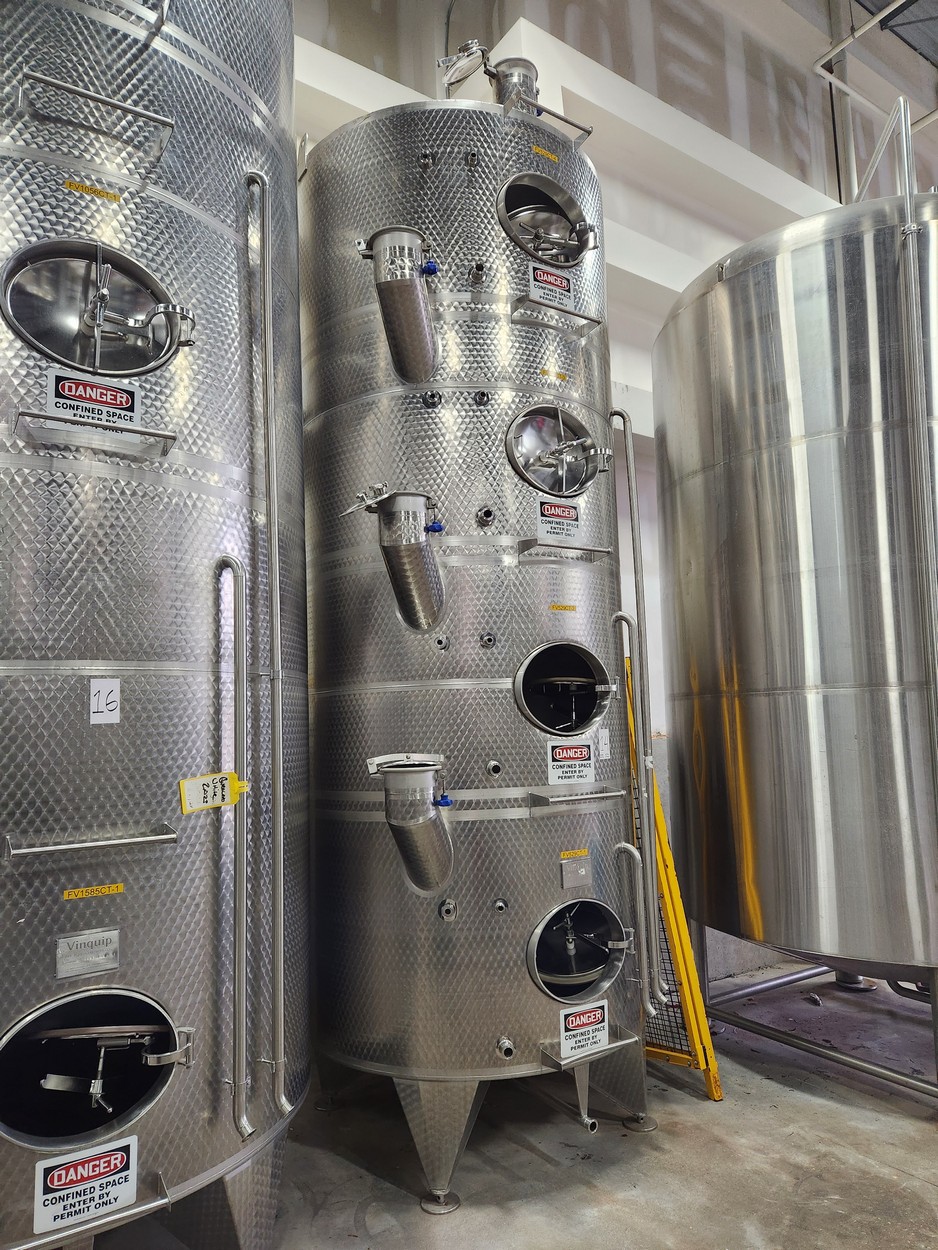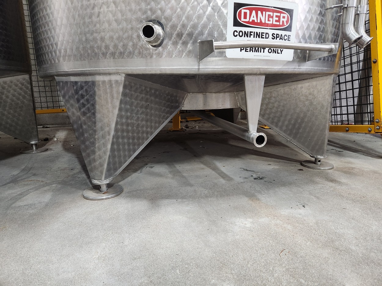 10,900 Liters (2,900 Gallon) Vinquip Jacketed Stainless Steel Tank with Four Compartments, Top/Side Overflow Vents, Dome Bottom, and Adjustable Legs