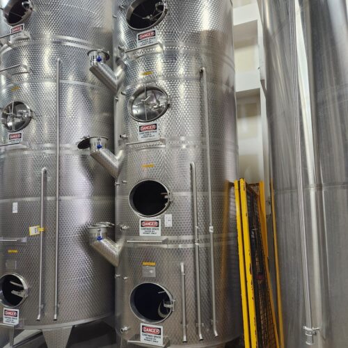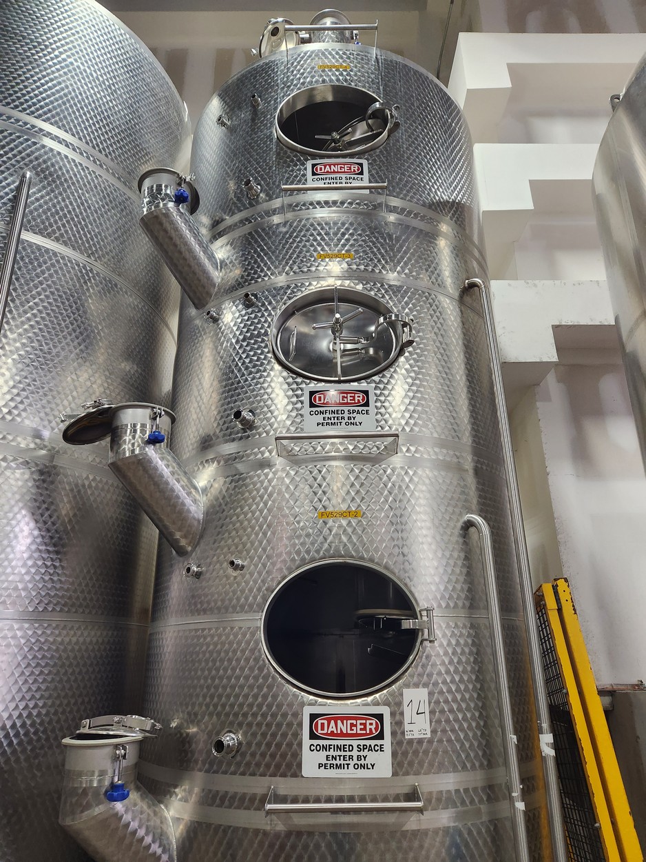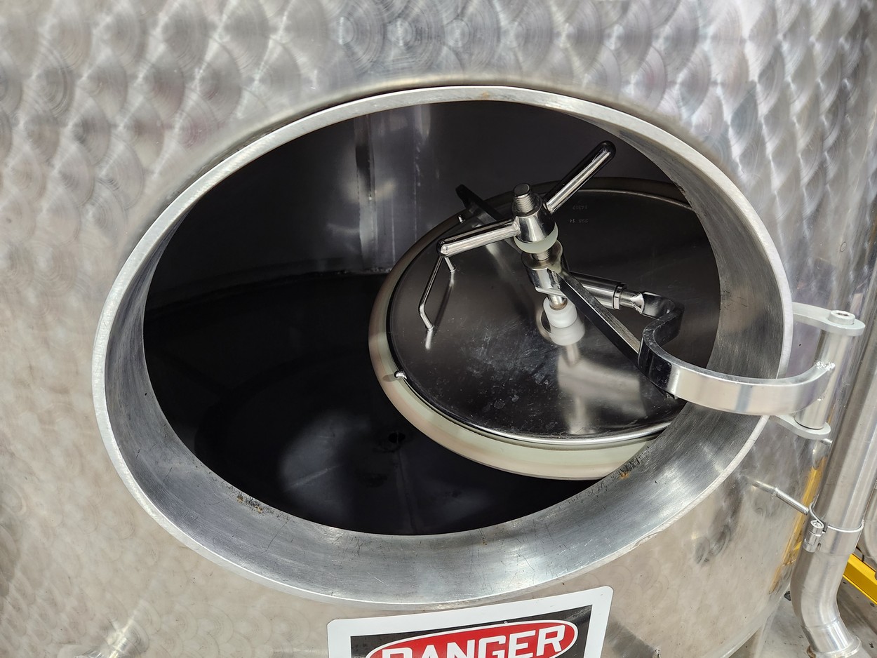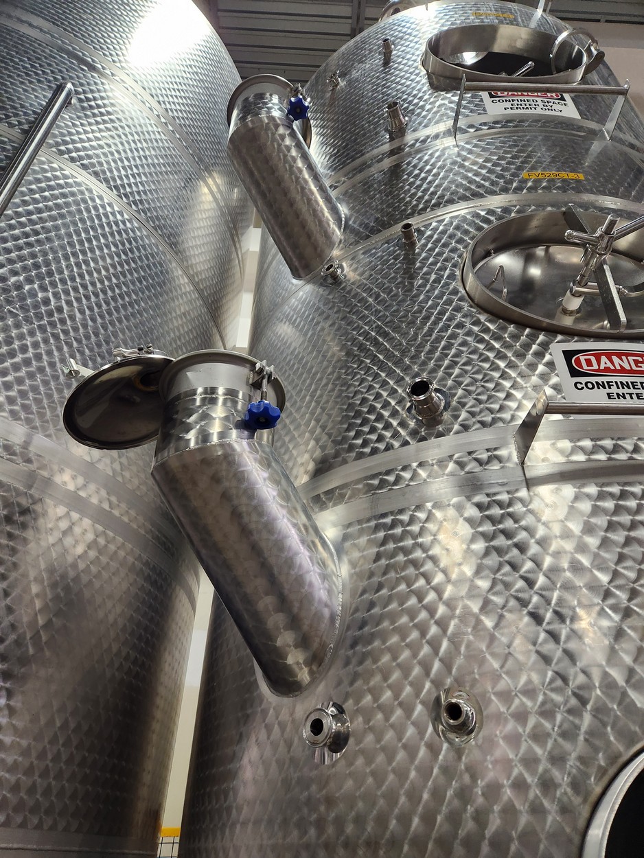 10,900 Liters (2,900 Gallon) Vinquip Jacketed Stainless Steel Tank with Four Compartments, Top/Side Overflow Vents, Dome Bottom, and Adjustable Legs