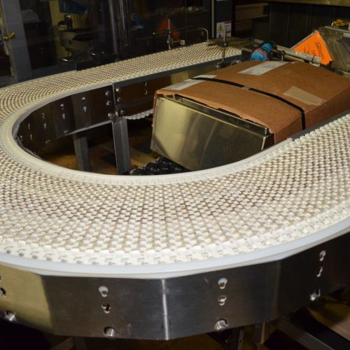 12 in Wide 180 Degree U-Shaped Conveyor with Plastic Interlocking Chain. S/S Frame with Height Adjustable Feet. 5 ft OD, 3 ft ID. Current Belt Height is 37 in. Adjustable to Minimum 34 in H and Maximum 38 in High. 208-230/460 V, 3 Ph, 60 Hz, 1725 RPM.