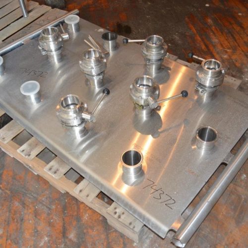 (12) Position S/S Pipe Manifold with 3 in Diameter Tri Clamp Inlets/Outlets and (6) S/S Manual Butterfly Valves. 52 in W x 32 in H Panel with S/S Legs on Side.