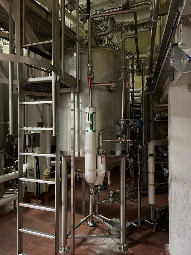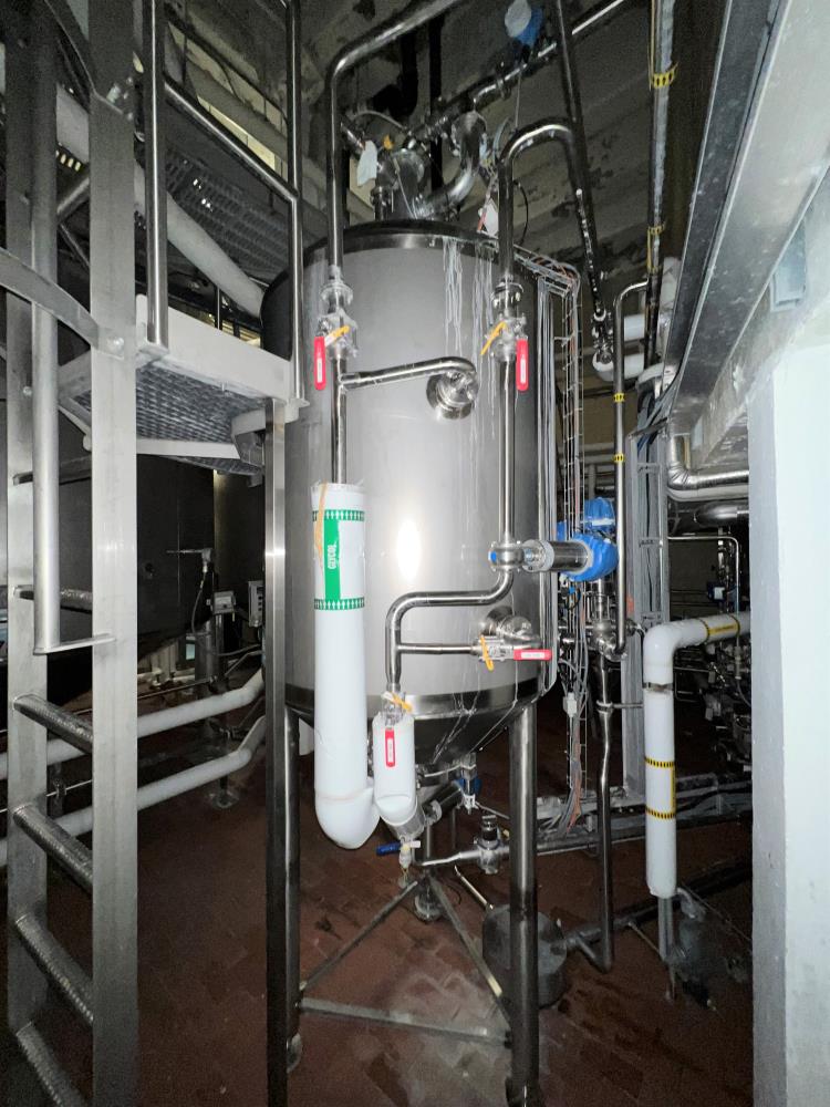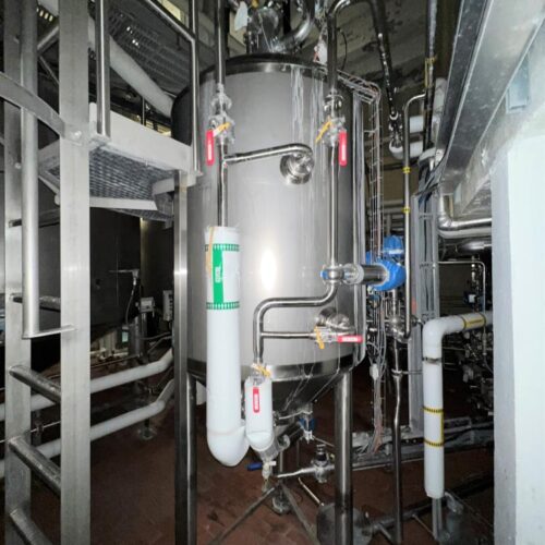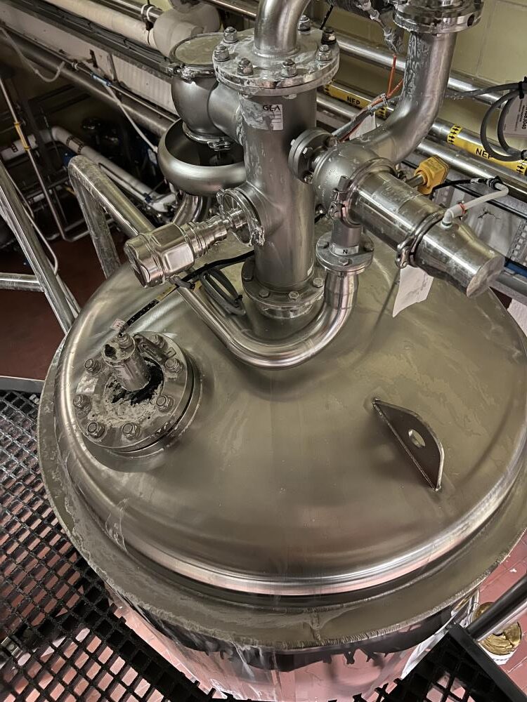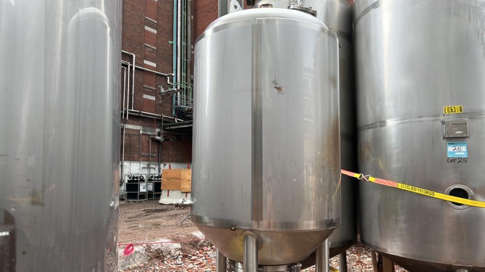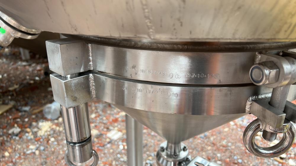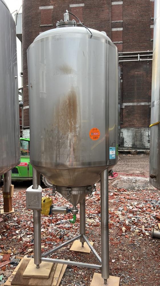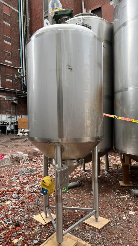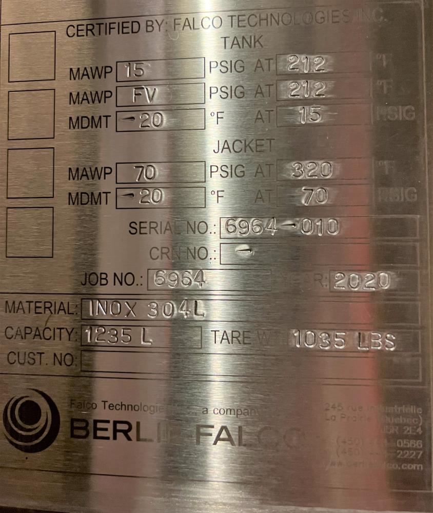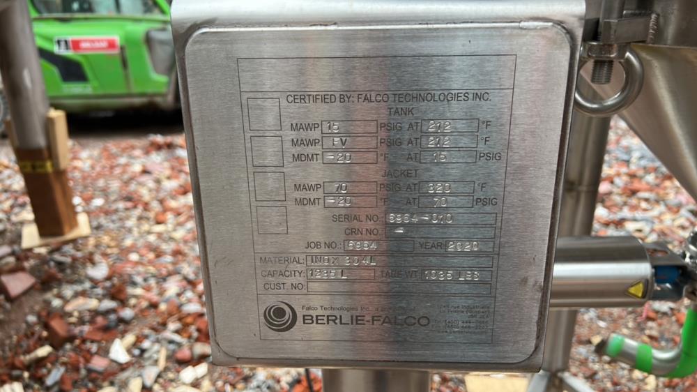 1,235 Liter Berlie-Falco 304L Stainless Steel Vertical Jacketed Pressure Tank, Approximate 40″ diameter x 50″ straight side, dished top, removeable coned bottom. Internal rated 15 psi/FV at -20 to 212 degrees F., jacket rated 70 psi at -20 to 320 degrees F. Center bottom outlet. Mounted on 3 stainless steel legs. LADDER & PLATFORM NOT INLCUDED
