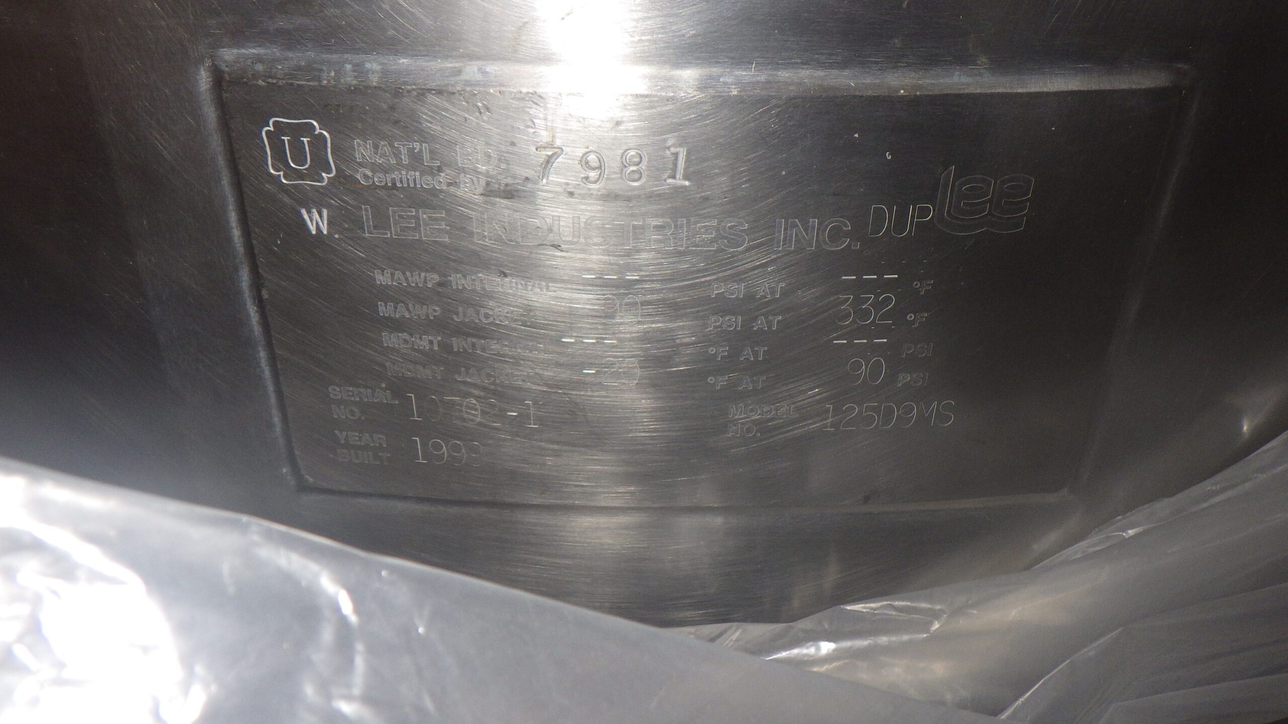 125 Gallon Lee Model 125D9MS S/S Double Motion Jacketed Kettle, 90 PSI at 332 Degrees F Jacket Maximum Working Pressure, NB# 7981
