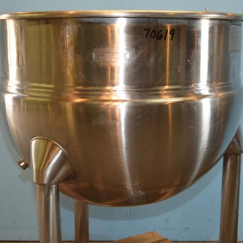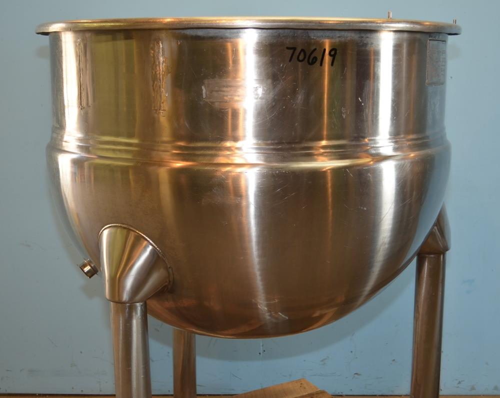 150 Gallon Hamilton Model SA Stainless Steel Open Top Jacketed Kettle. Maximum Working Pressure 90 PSI at 320 Degrees F. 44 in Interior Diameter, 33 in Deep, Center Bottom Outlet, 25 in Discharge Height, National Board Number 4754, (3) 33 in H Stainless Steel Legs