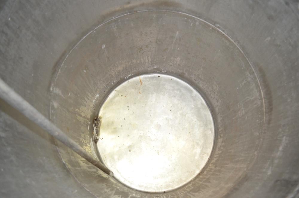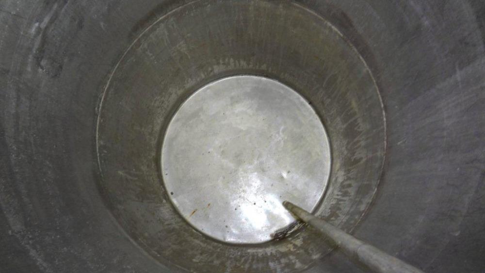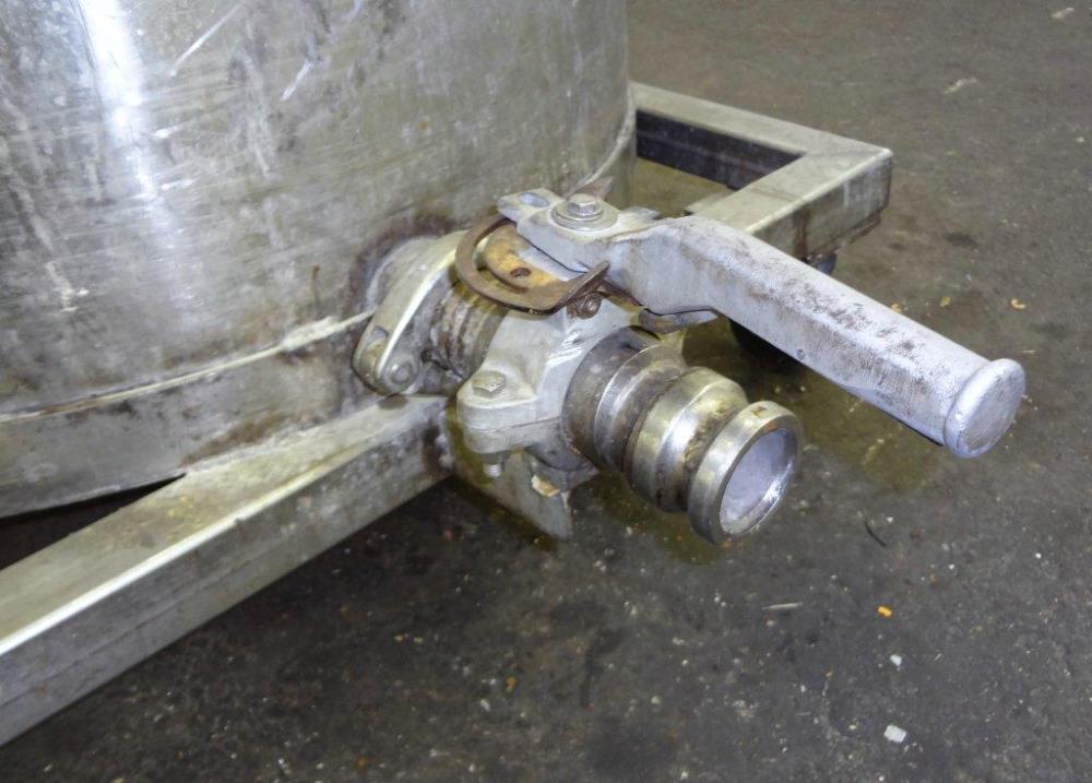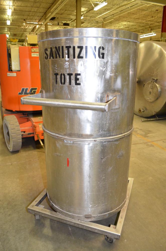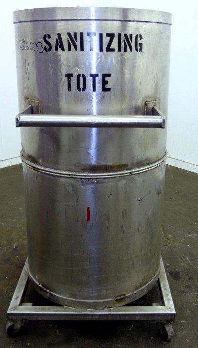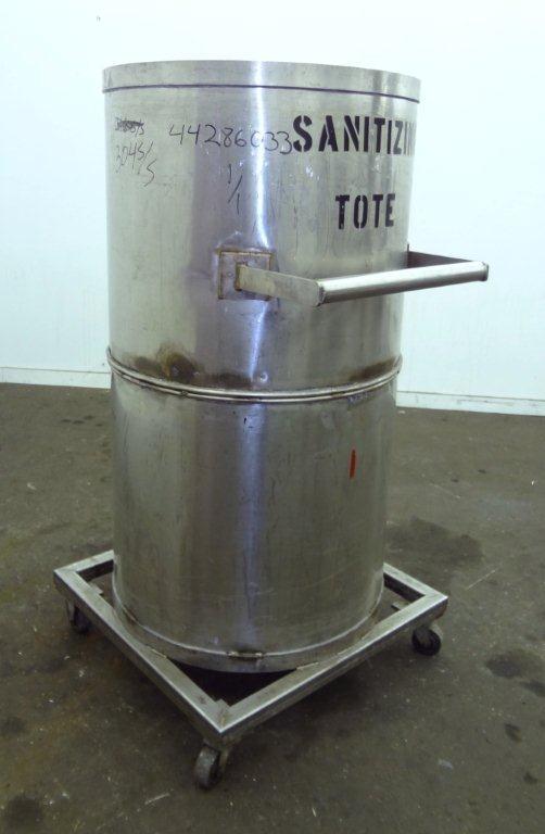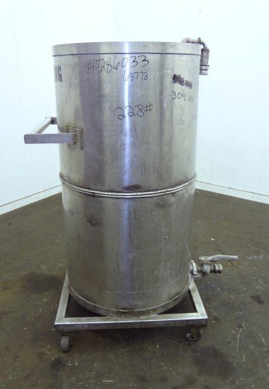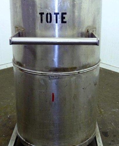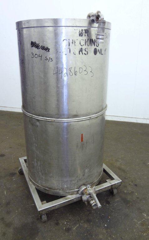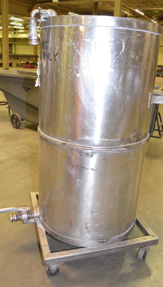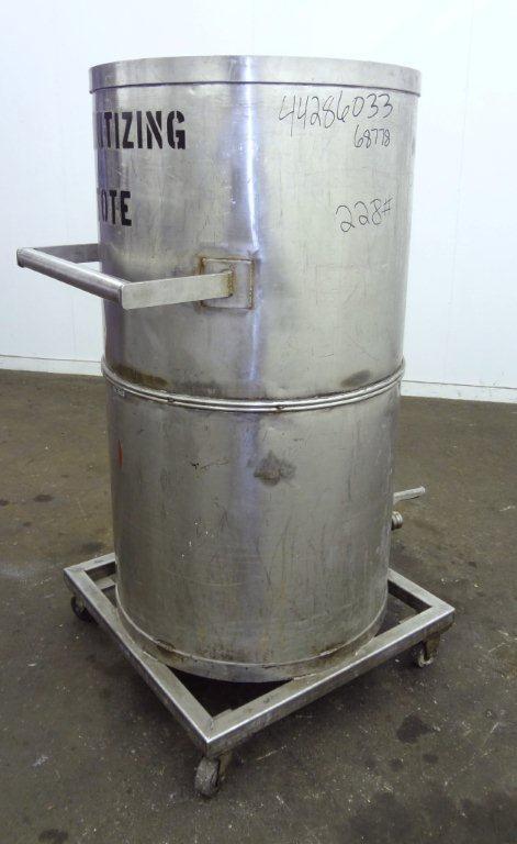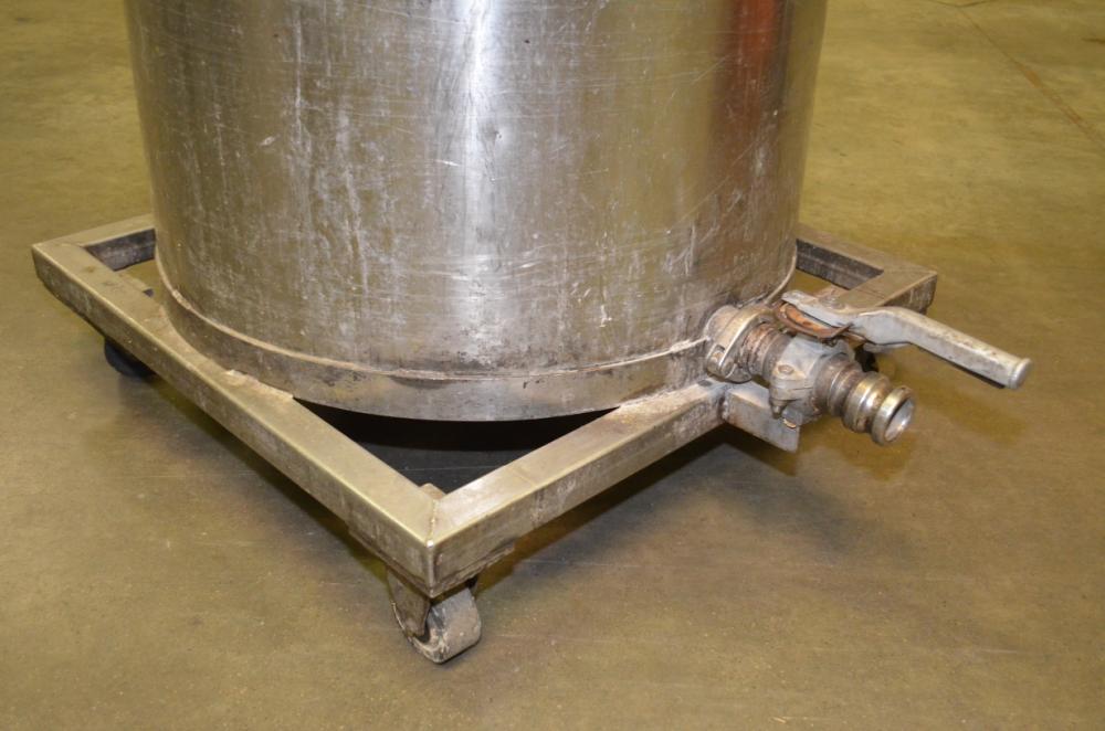 150 Gallon Stainless Steel Single Wall Vertical Portable Tote, Open Top no Cover, 50 in Straight Side, 31 1/2 in Diameter, 2 in Diameter Inlet, 2 in Diameter Side Bottom Outlet with Valve, Mounted on S/S Frame with (4) Casters.
