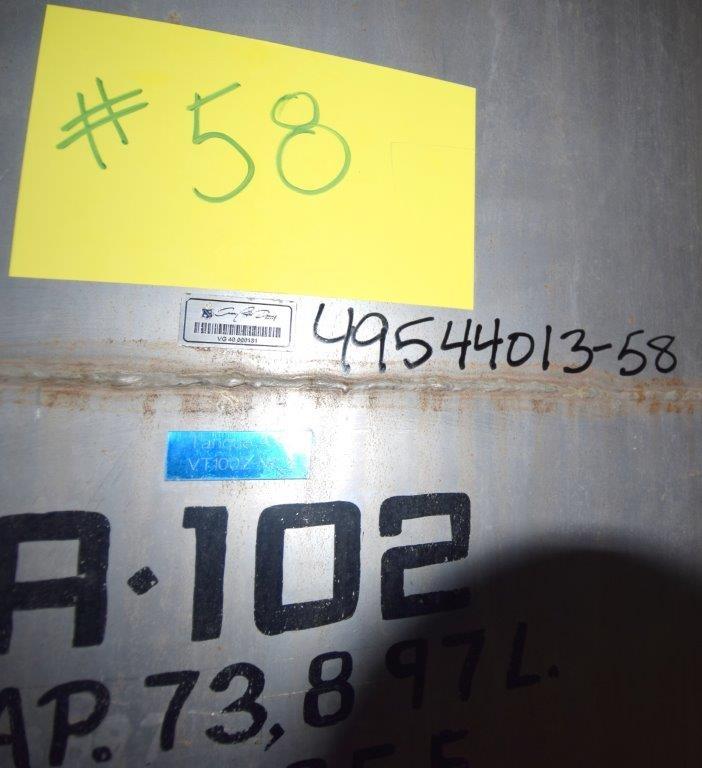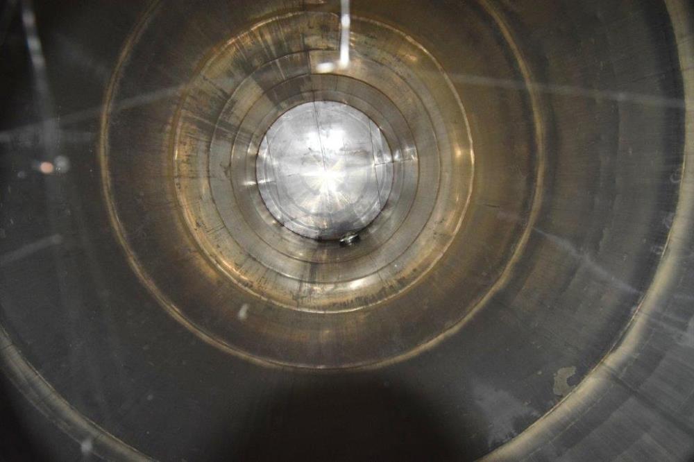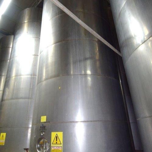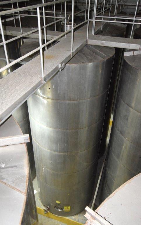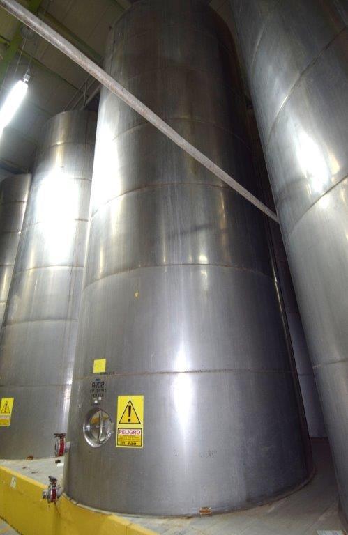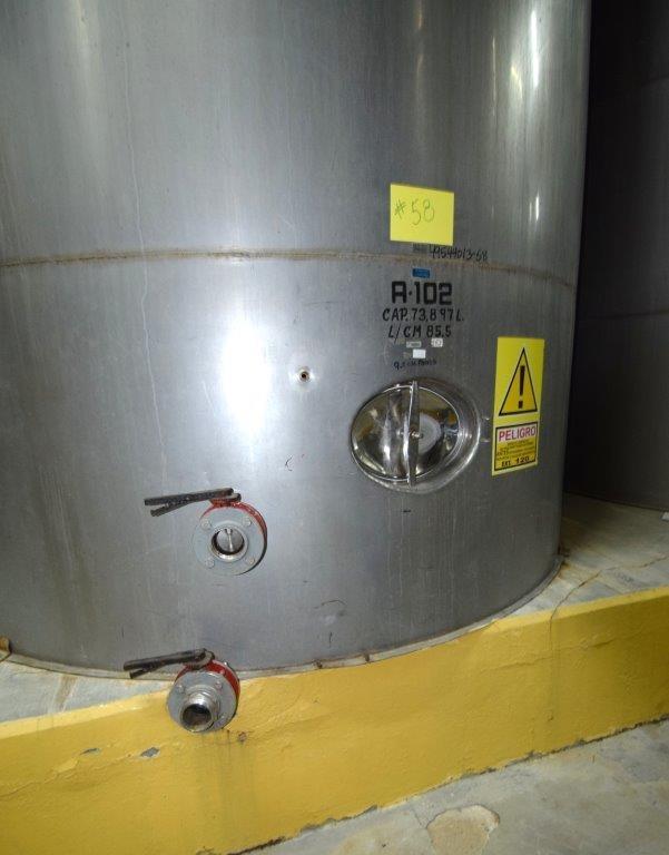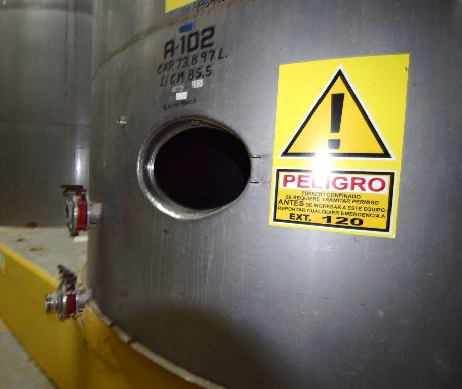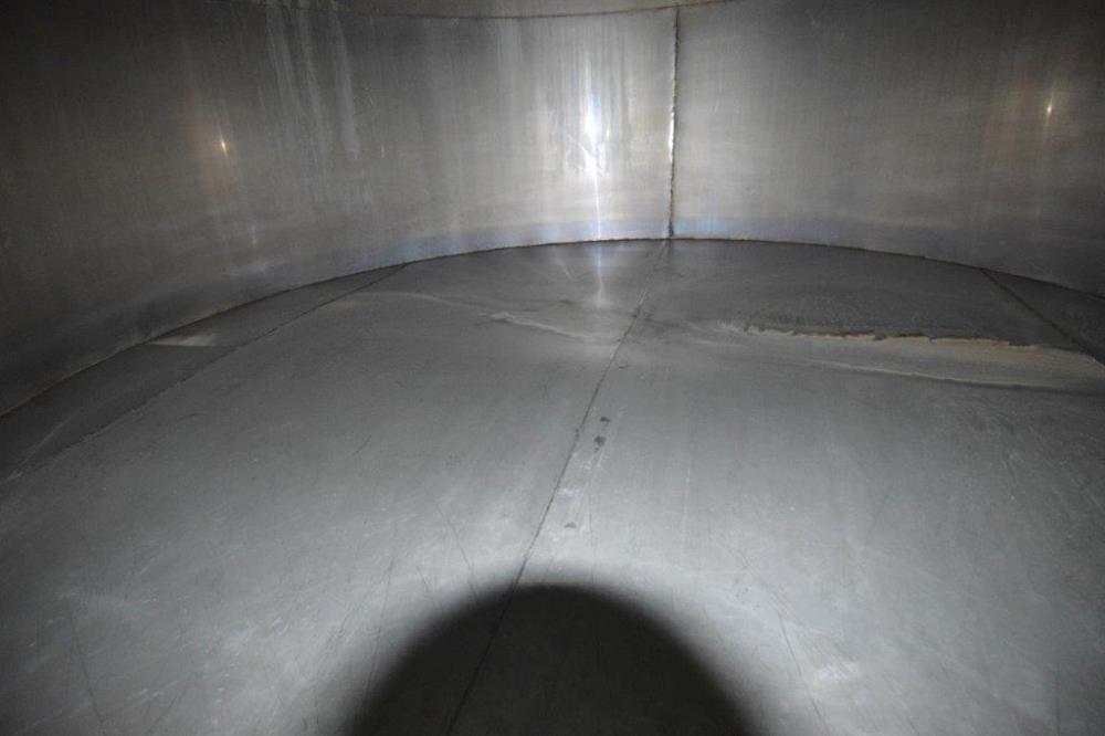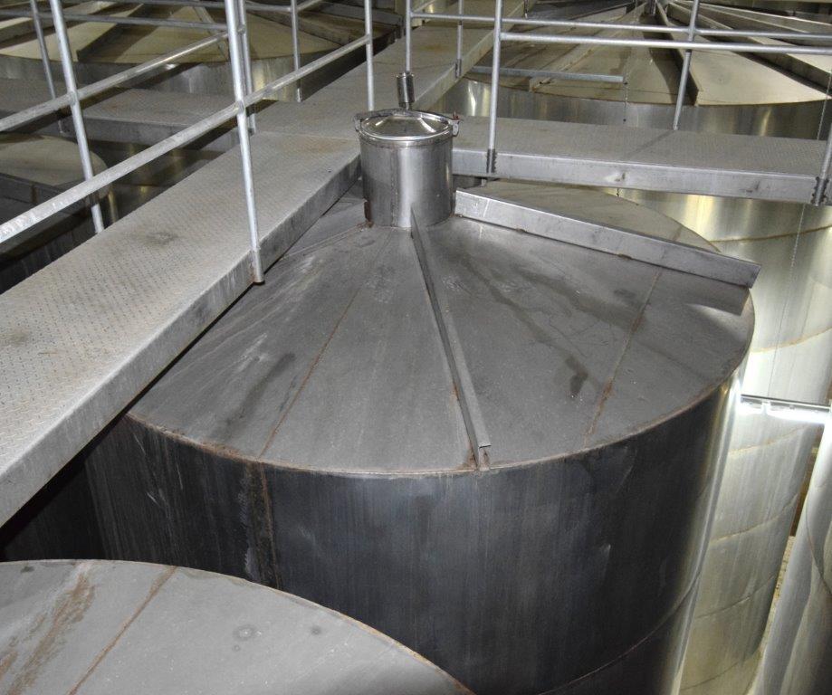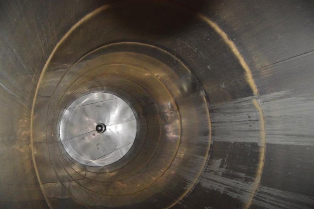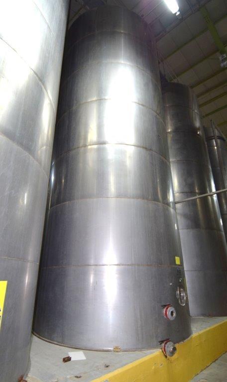 19,500 Gallons (73,897 Liters) Capacity (Approx.) Vertical S/S Single Wall Tank. 304 Stainless Steel, 14 Gauge Thickness. 10.8 Feet (3.3 Meters) Diameter x 28.8 Feet (8.78 Meters) Straight Side, Coned Top, 7 in Sloped Bottom. 16 in Diameter Top Manway with Cover and Approximate 16 in Tall Collar, 3 in Diameter Side Opening, 3 in Bottom Outlet, 12 in x 17 in Oval Side Manway with Cover.