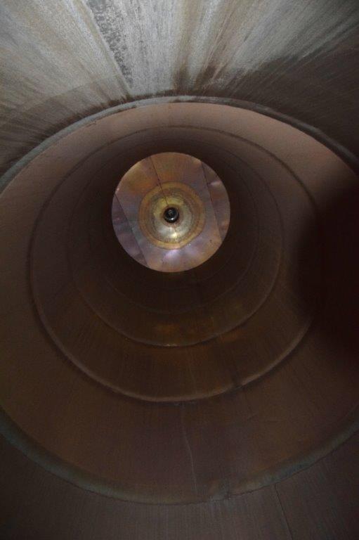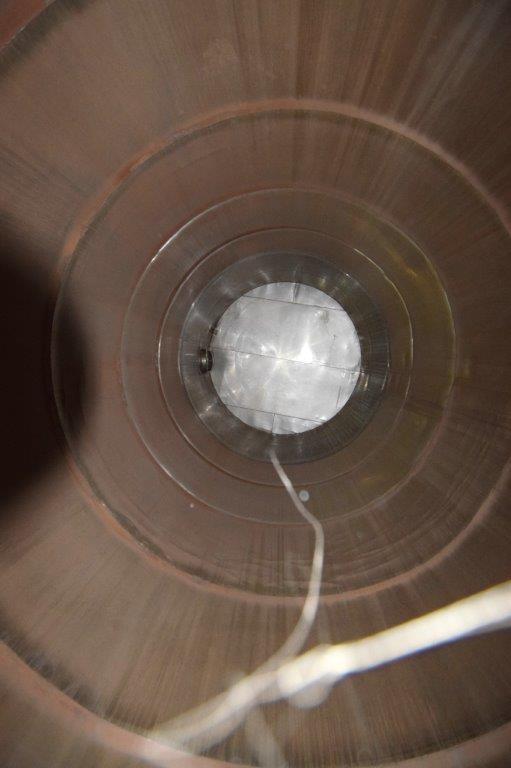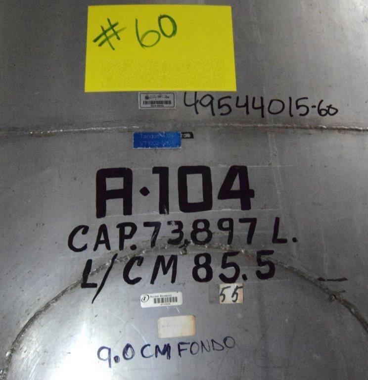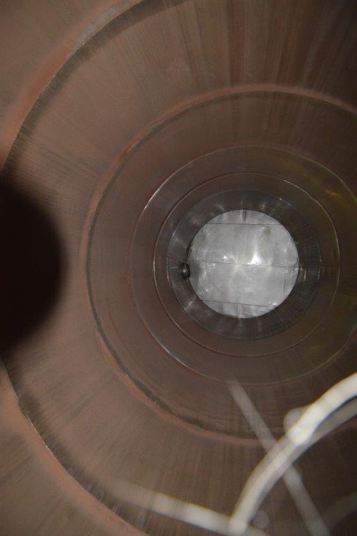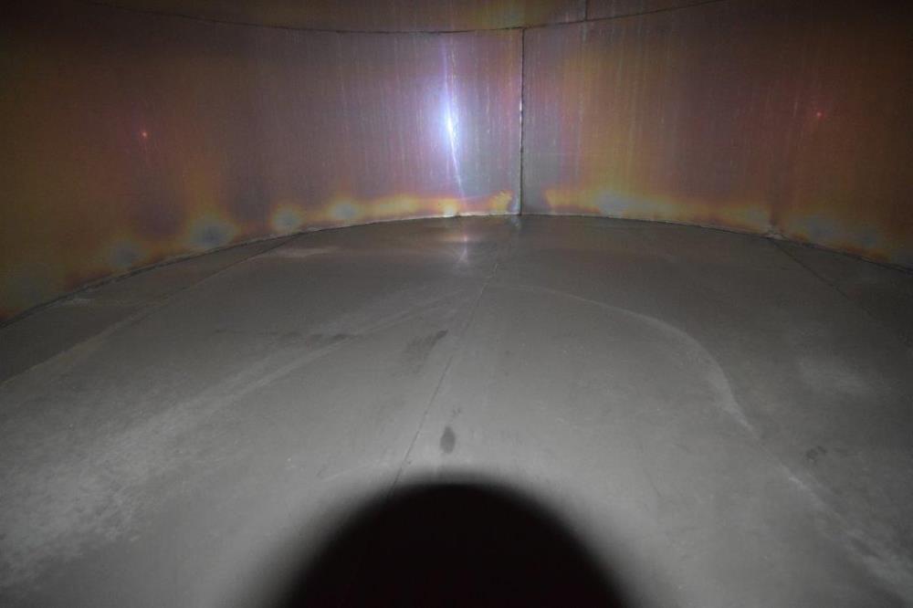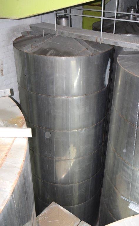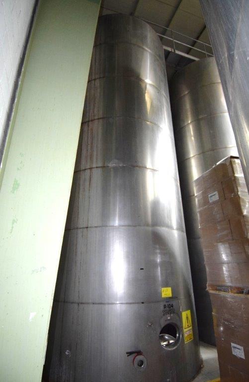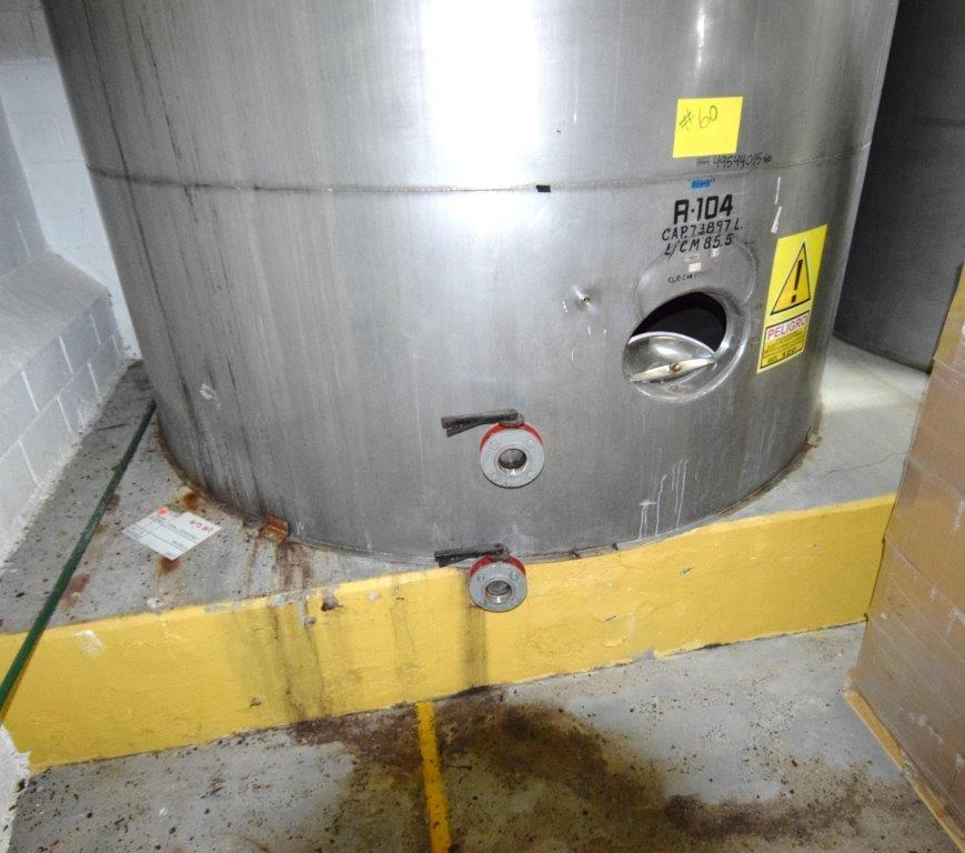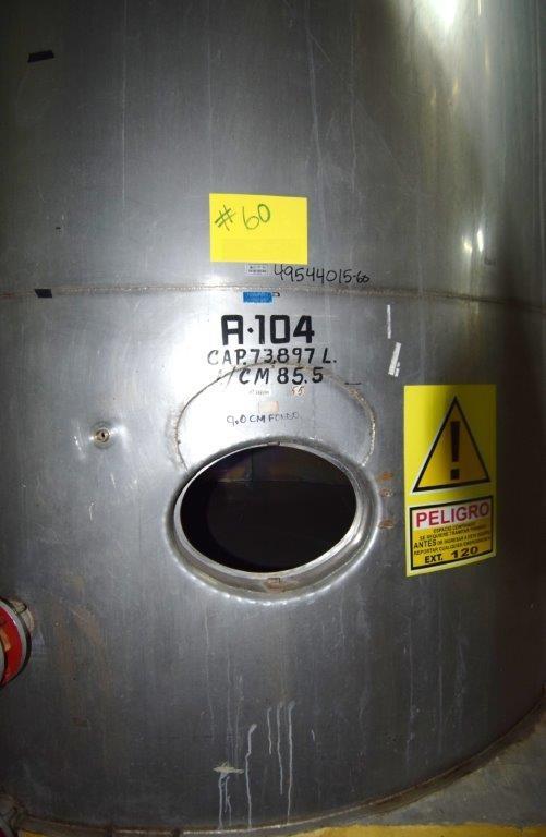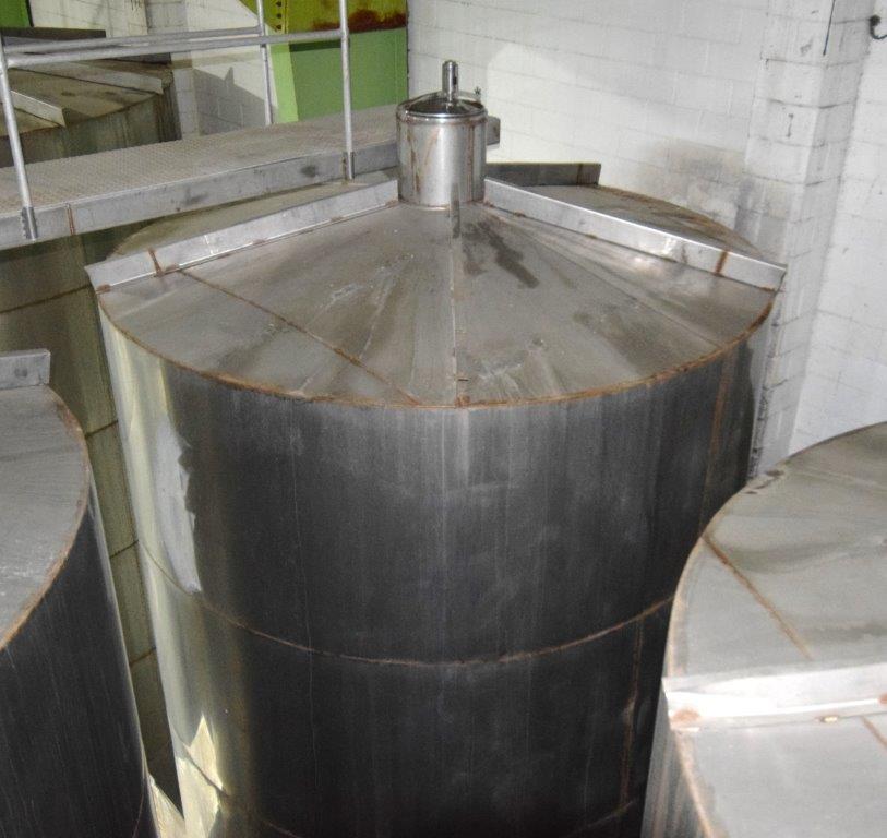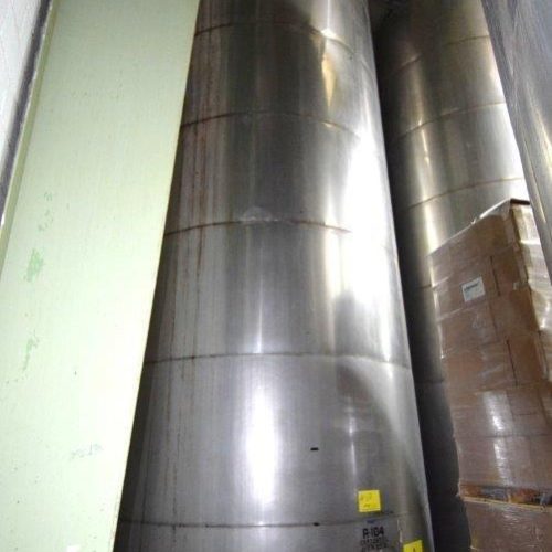 19,500 Gallons (73,897 Liters) Capacity (Approx.) Vertical S/S Single Wall Tank. 304 Stainless Steel, 14 Gauge Thickness. 10.8 Feet (3.3 Meters) Diameter x 28.8 Feet (8.78 Meters) Straight Side, Coned Top, 7 in Sloped Bottom. 16 in Diameter Top Manway with Cover and Approximate 16 in Tall Collar, 3 in Diameter Side Opening, 3 in Bottom Outlet, 12 in x 17 in Oval Side Manway with Cover.