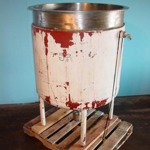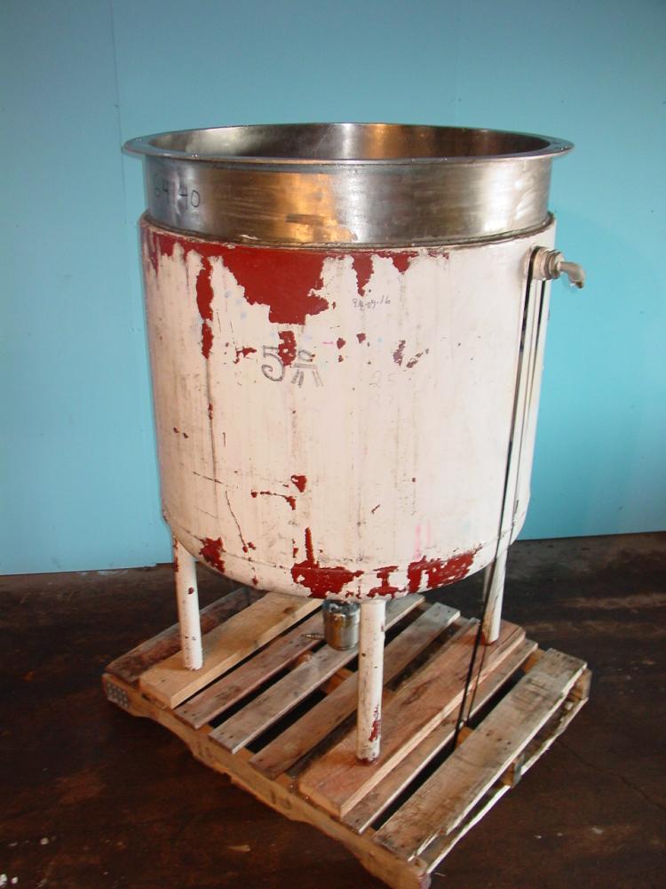 200 Gal Perry Jacketed Tank. Dish Bottom, open top, C/S outer jacket 60 psi at 300 Degrees F, Natl Board number 1209, 39 in dia x 36 in str side, 1 1/2 in dia cbo w/ air actuated valve, (4) c/s 22 in L legs, 10 in discharge, shell 5/16 in thick jacket 3/16 in thick