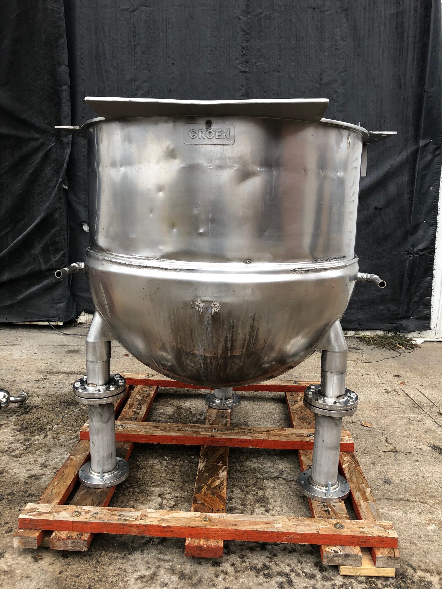 200 Gallon Groen Model TA200SP S/S Jacketed Kettle. Approx. 52 in Diameter x 62 in H. Open Top. Jacket Maximum Working pressure 125 PSI. 4 in Diameter Outlet.