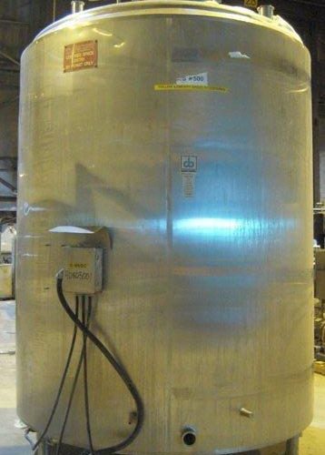 2000 Gal Cherry Burrell S/S Tank, 316 stainless steel, vertical. Approximately 84 in diameter x 96 in straight side, dished top, sloped bottom. Insulated with stainless steel sheathing. Channel jacket, no rating. Fixed stainless steel agitator bridge. Approximate 1 1/2 in diameter bottom supported shaft with a 2 blade bottom sweep blade and a twisted four blade agitator, driven by a 5/2.5 hp, 3/60/575 volt, 1750/850 rpm gearmotor. (1) top mounted adjustable baffle, (2) spray balls. Openings: top (2) 3 in tri-clamp, 4 in tri- clamp, 18 in manway with cover; approximate 3 in tri-clamp side bottom outlet. Mounted on 3 stainless steel legs, approximate 16 in discharge height