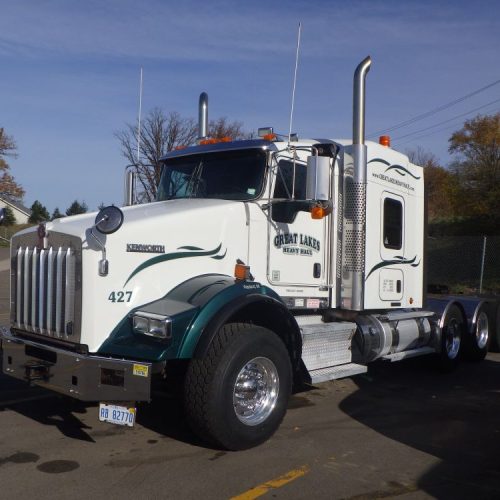 2014 Kenworth Model T800 Truck Tractor. Tri-Axle, 72 in Aerocab Sleeper Cab, Cummins 550-HP ISX15 Diesel Engine, Fuller RTLO18918B 18-Speed Manual Transmission, Engine Brake, Pusher Lift Axle, Dual Power Steering, Air Ride Suspension with Dump Valve, Double Steel Frame, Dual 60/110-Gallon Steel Fuel Tanks, 20.7-Gallon DEF Tank, 60-Gallon Hydraulic Tank, Headache Rack, Air Slide 5th Wheel, Wet Kit, PTO, 18,740# Front Axle, 23,000# Rear Axles, 4.10 Ratio, 260 in Wheel Base, 445/65R22.5 Front Tires, 11R22.5 Rear Tires, 295/75R22.5 Pusher Axle Tires, Aluminum Disc Wheels, Average Tires.