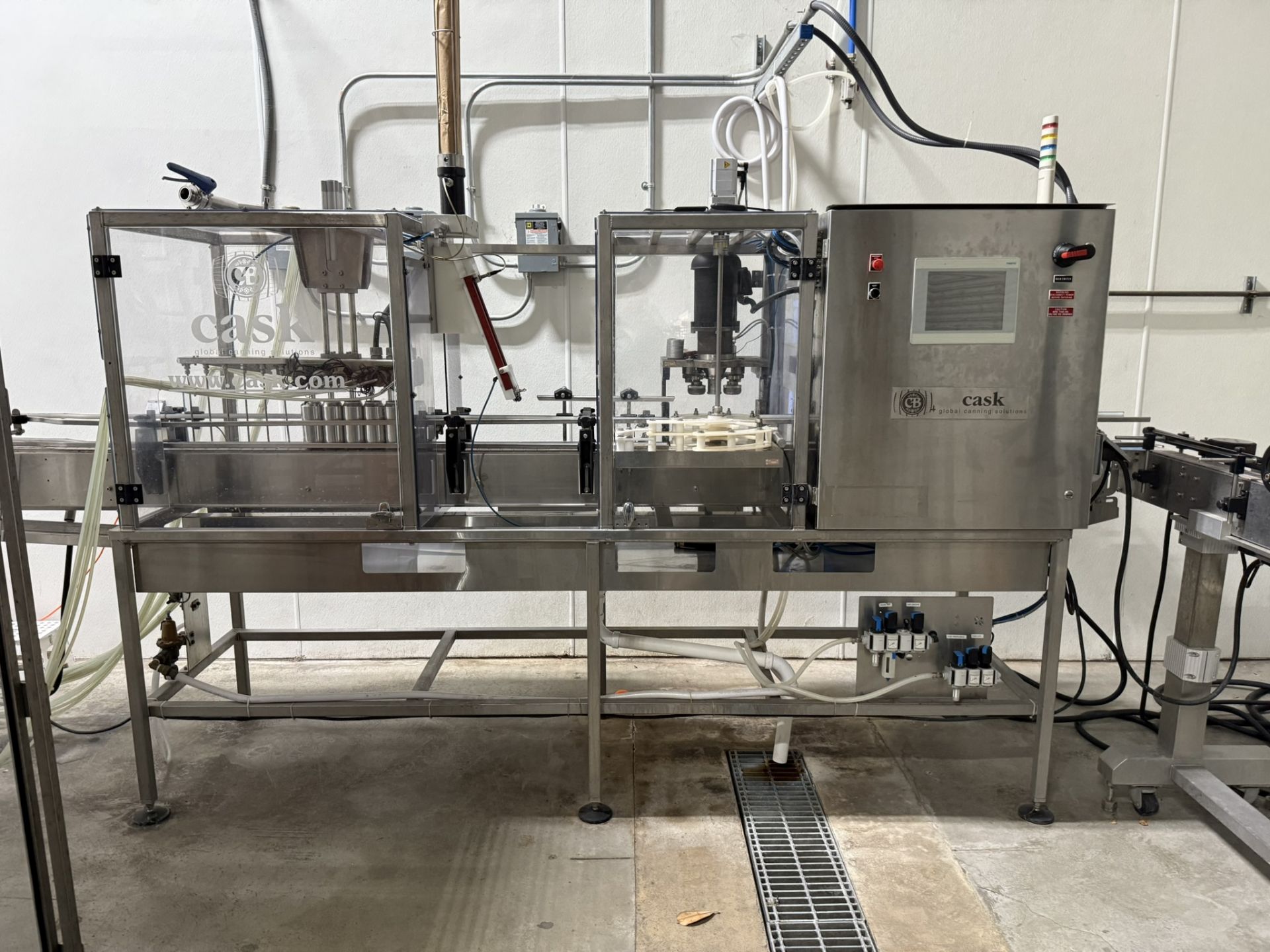 2019 CASK Global Canning Solutions Model ACS-5V Can Filler and Seamer, 6 head Rinser, 6 head Filler, Single Head Can Seamer, Includes Approx 12′ 3 1/4″ Table Top Conveyor, 208-240 V, Single Phase, S#ACSV5 078-177-19