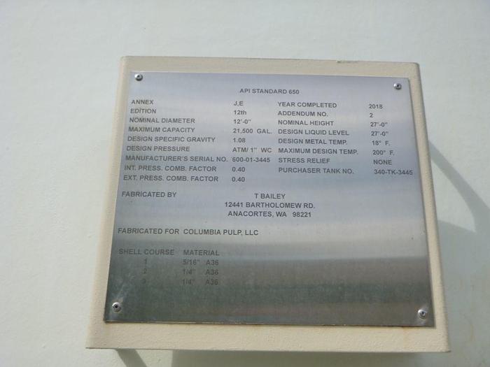 21,500 Gallon A36 Steel Tank 27′ Tall 12′ Diameter