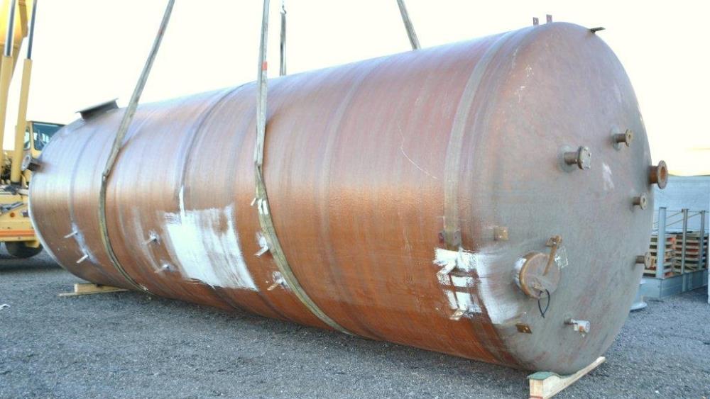 22,036 Gallon Air Plastics Fiberglass Vertical Storage Tank. Approximate 132 in diameter x 364 in straight side, dished top, flat bottom. Fabricated in accordance with ASTM D-3299, filament wound vessel, 1 ply C veil, inner liner with 110 mil corrosion barrier using Hetron 922 resin. Clear exterior gel coat, 1.20 specific gravity, rated to 180 degrees F. Openings top (3) 2 in, 3 in, 6 in, 12 in hand hole with cover, side 24 in man way with cover, 3 in, 2 in, approximate 8 in side bottom outlet. Includes a carbon steel side ladder, and top safety rail.