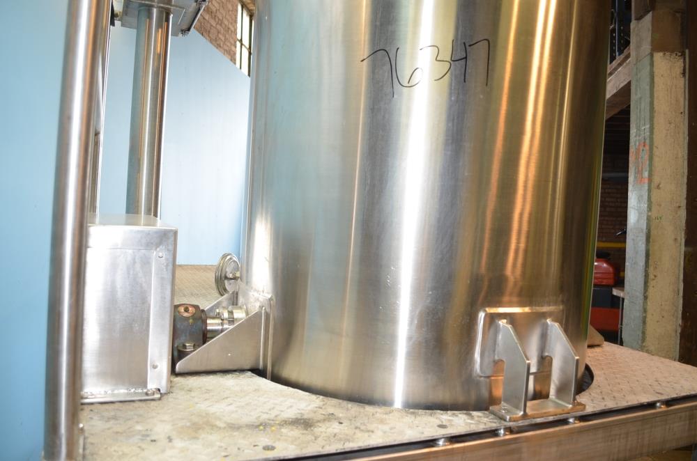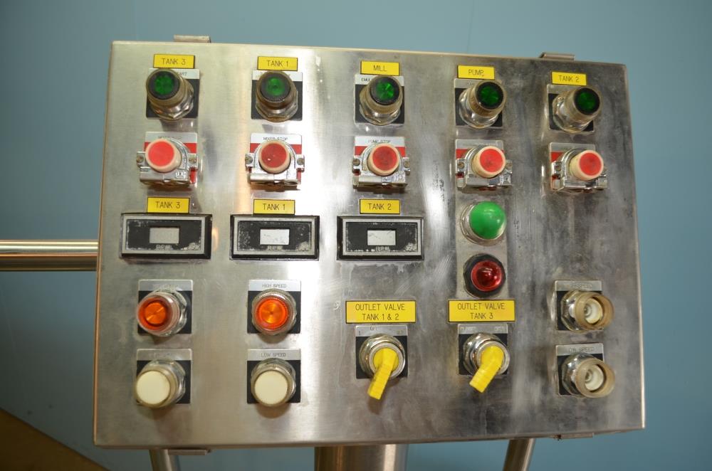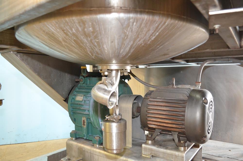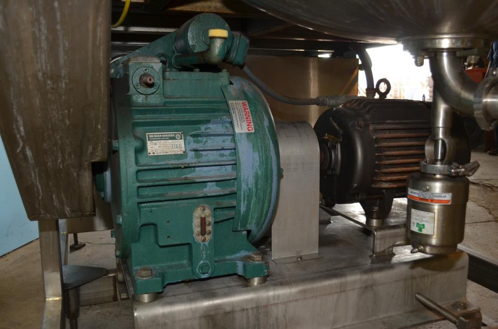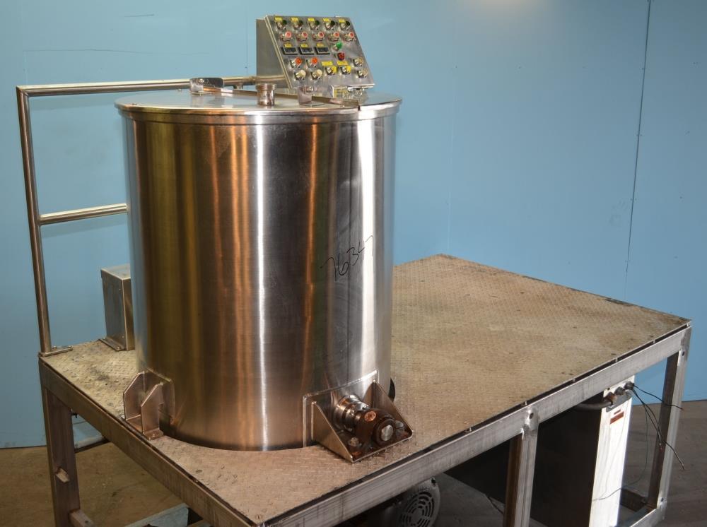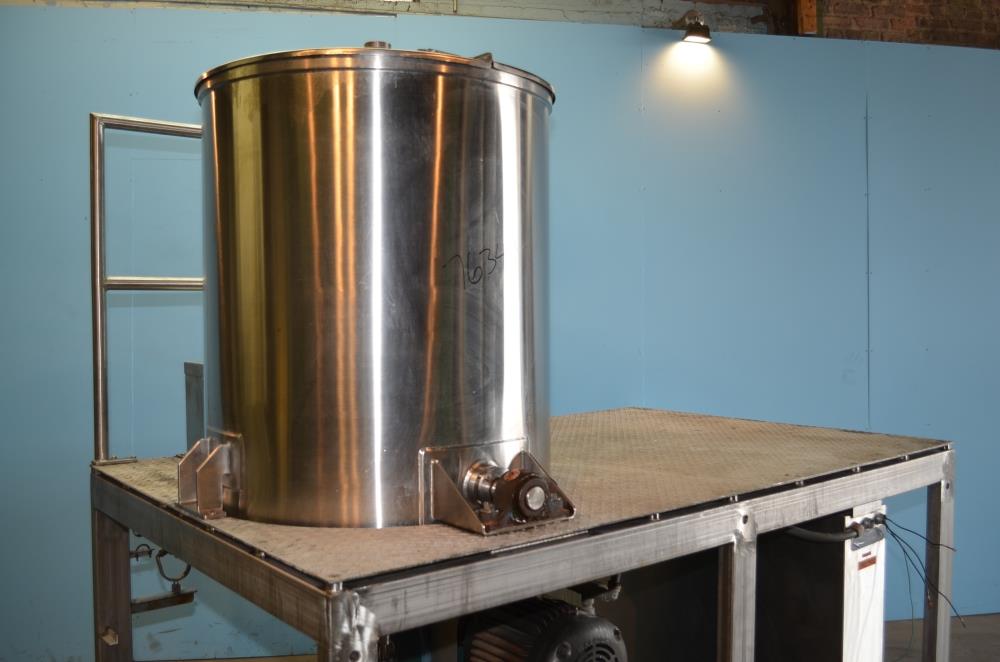 225 Gallon (Approx) S/S Vertical Single Wall Medium Shear Mixing Tank / Dixie Mixer. Closed Top, Cone Bottom. 36 in Diameter x 50 in Deep. (3) Bottom Mounted Squirrel Cage / Dixie Style Agitators, (1) 18 in Diameter Rotor, (2) 10 in Diameter Rotors. Closed S/S Top with 1/2 S/S Hinged Cover. (1) 2 in Diameter Sanitary Threaded Top Inlet. 4 in Diameter CBO with Attached 2 1/2 in Diameter S/S Tri-Clamp Outlet with S/S Pneumatic Valve. Discharge Height 36 in to Bottom of Tank and 31 in to S/S Pipe. Side Mounted Temperature Probe.15 HP Drive with Variable Speed Gearbox. Approximate Agitator Minimum Speed 120 RPM and Maximum Speed 400 RPM. Belt Driven. Mounted on S/S Operator Platform with Diamond Plate, 48 in Platform Height with Height Adjustable Feet. S/S Controls Pedestal on Platform. 460 V, 3 Ph, 60 Hz.
