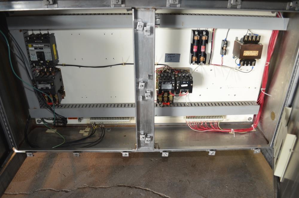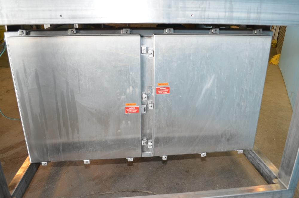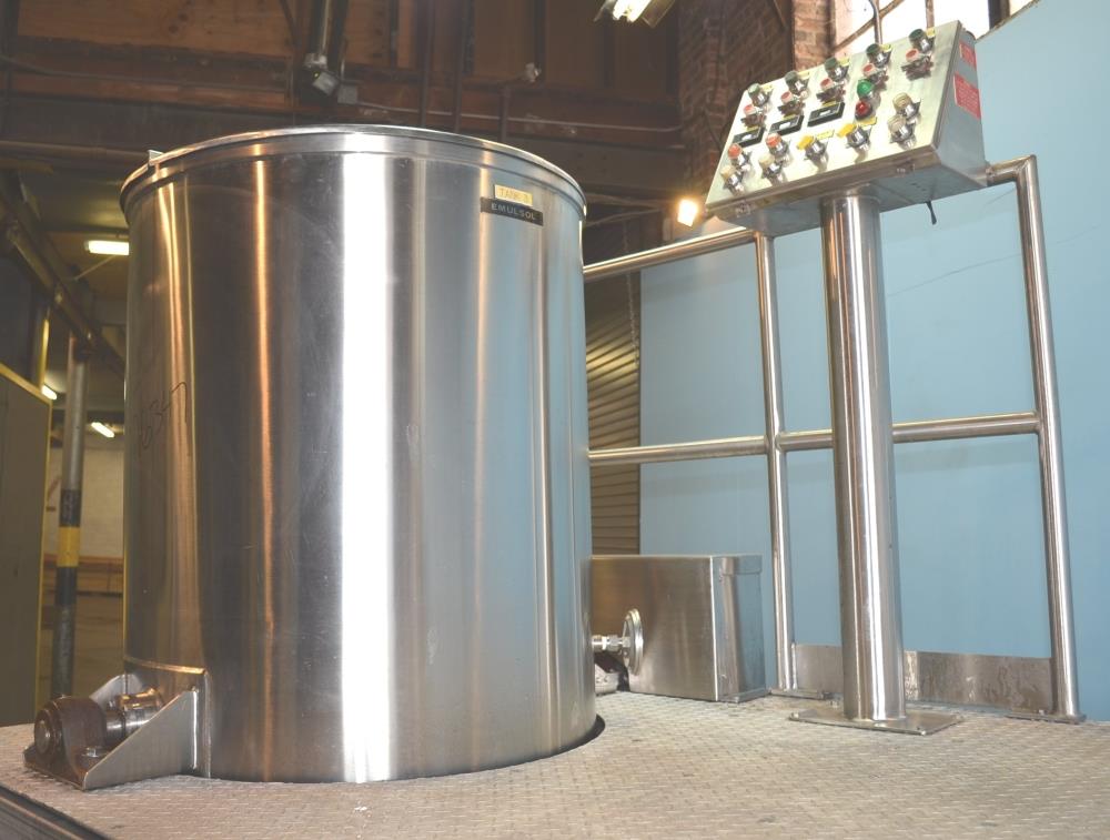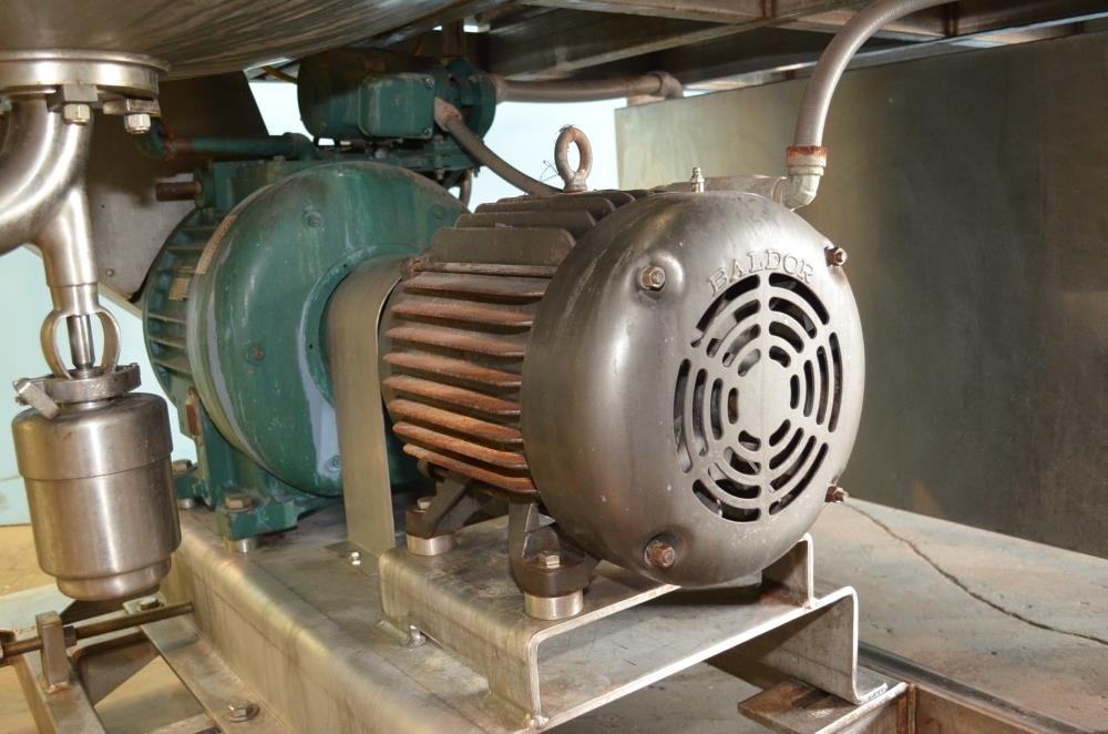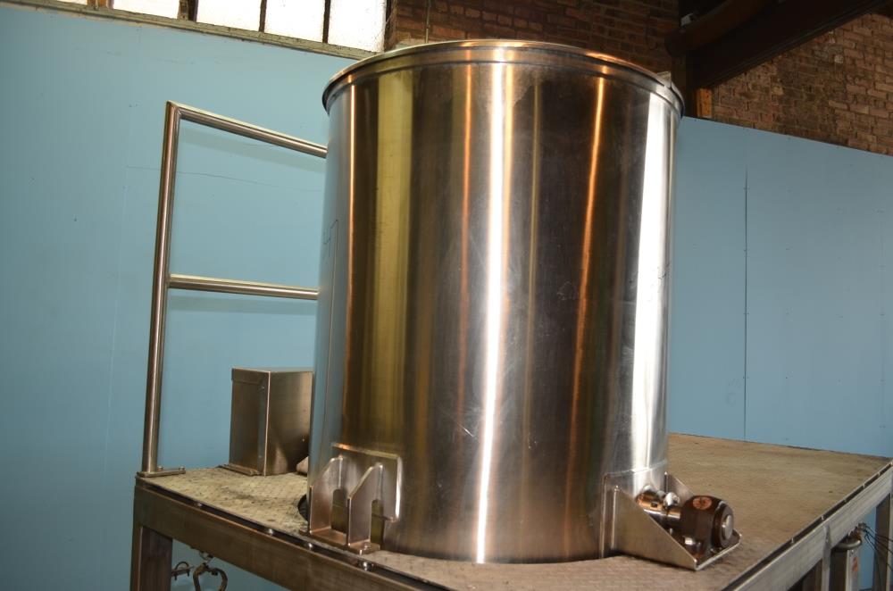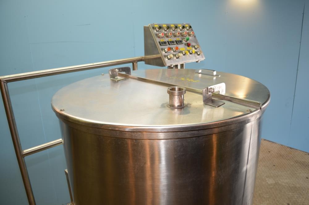 225 Gallon (Approx) S/S Vertical Single Wall Medium Shear Mixing Tank / Dixie Mixer. Closed Top, Cone Bottom. 36 in Diameter x 50 in Deep. (3) Bottom Mounted Squirrel Cage / Dixie Style Agitators, (1) 18 in Diameter Rotor, (2) 10 in Diameter Rotors. Closed S/S Top with 1/2 S/S Hinged Cover. (1) 2 in Diameter Sanitary Threaded Top Inlet. 4 in Diameter CBO with Attached 2 1/2 in Diameter S/S Tri-Clamp Outlet with S/S Pneumatic Valve. Discharge Height 36 in to Bottom of Tank and 31 in to S/S Pipe. Side Mounted Temperature Probe.15 HP Drive with Variable Speed Gearbox. Approximate Agitator Minimum Speed 120 RPM and Maximum Speed 400 RPM. Belt Driven. Mounted on S/S Operator Platform with Diamond Plate, 48 in Platform Height with Height Adjustable Feet. S/S Controls Pedestal on Platform. 460 V, 3 Ph, 60 Hz.