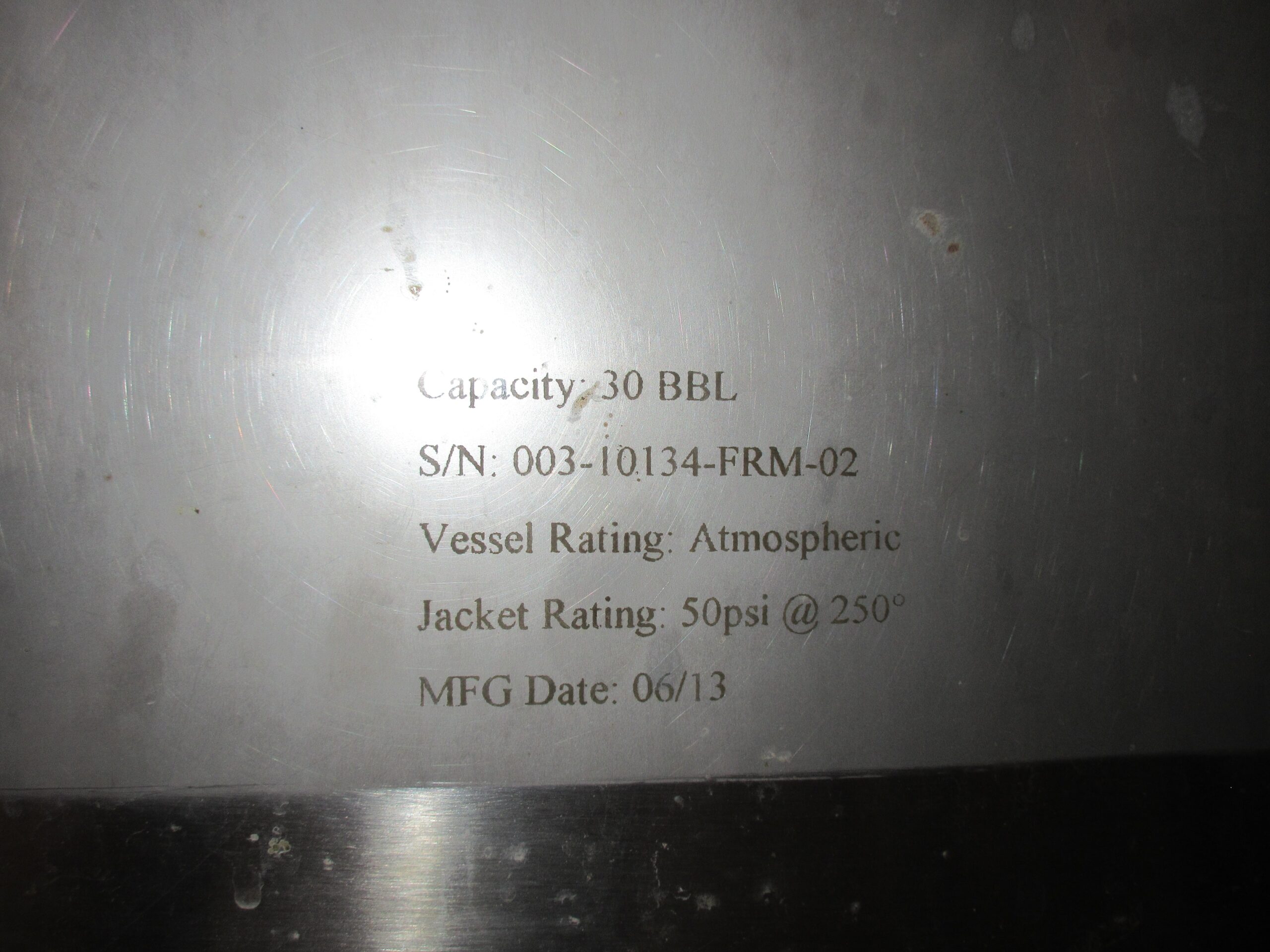 30 Bbl. Quality Tank Solutions Jacketed Vessel Qts Fv X 2 (39Bbl Flood) Jacket Rating 50 Psi @ 250 F Vessel Rating Atmospheric S/N: 003 – 10134 – FRM – 02 (2013)