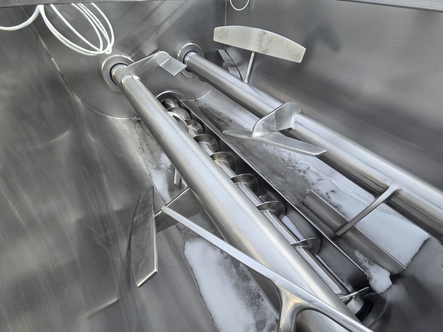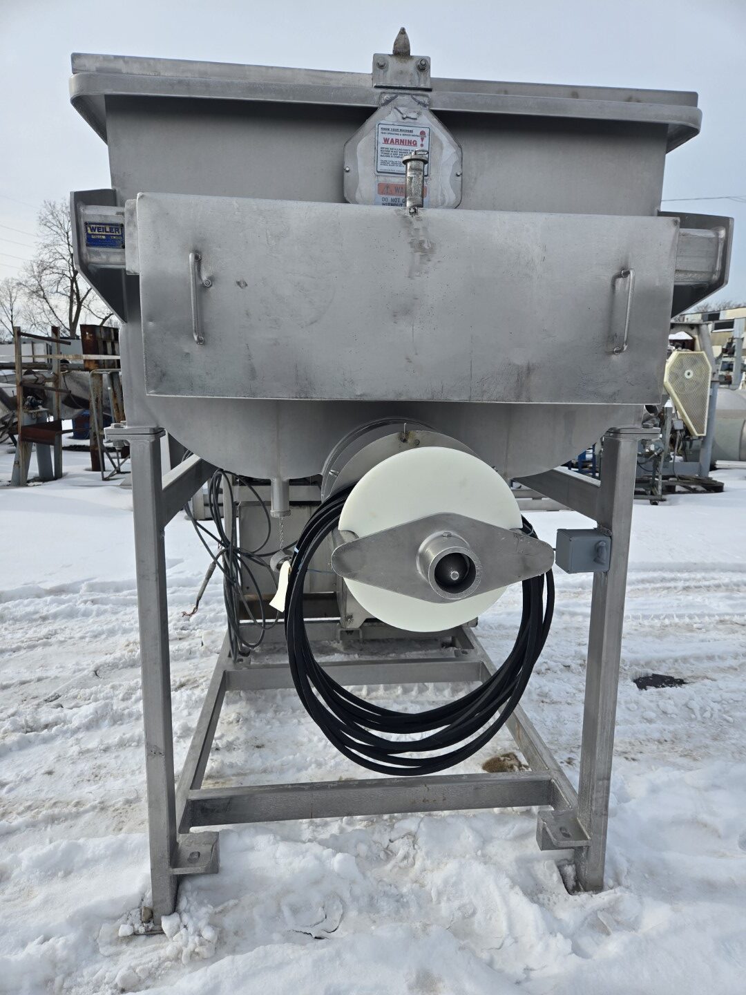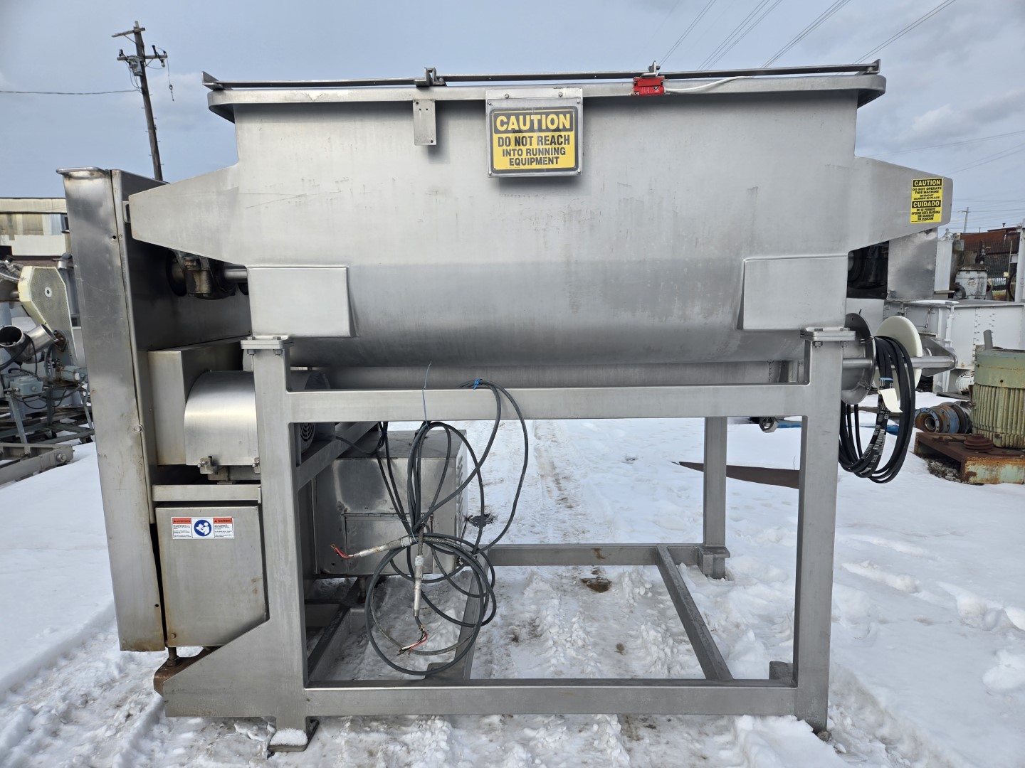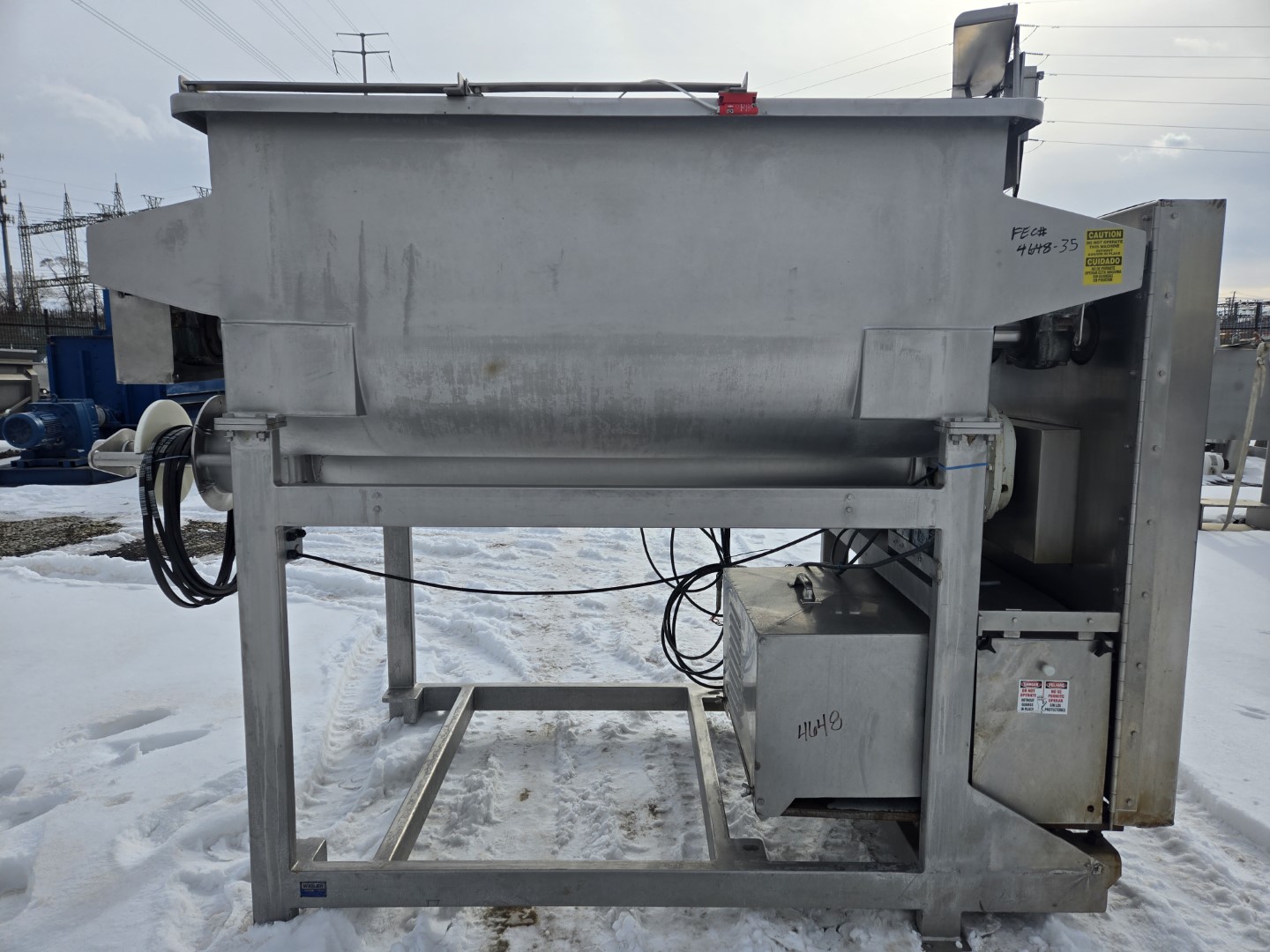 35 Cu Ft Weiler Model M305A S/S Dual Paddle Mixer. Approximately 50“ wide x 72” long trough with twin overlapping paddles, paddles driven by 10 hp, 230/460 volt motor drive, central unload auger screw discharge with independent motor drive, with spare paddle shafts, gears, and motors.