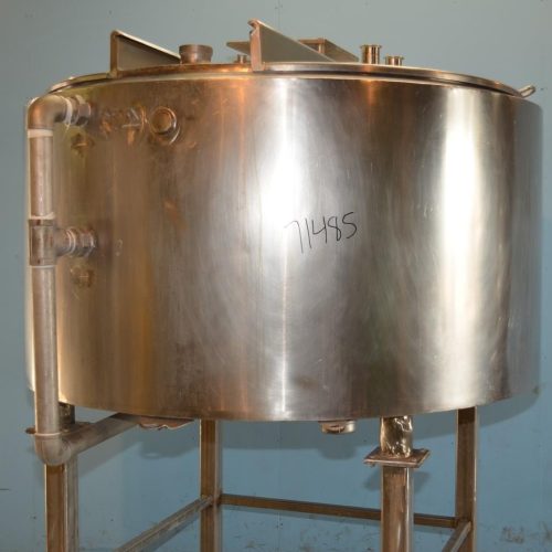 Approx 350 Gallon S/S Vertical Jacketed Tank. 5 ft Diameter, 29 in Deep, 33 3/4 in Straight Side, Flat Top with (2) S/S 1/3 Hinged Covers, Concave Bottom, Top Inlets Include (3) 2 in Diameter Tri-Clamp, (2) 1.5 in Diameter Tri-Clamp, (1) 3 in Diameter Sanitary Threaded, (1) 2.5 in Sanitary Threaded Reduced to 1.5 in Tri-Clamp, S/S Bridge with Provision For Agitator, Prop Style Agitator Blade with Two 3 Blade Props and Shaft (No Motor), 2 in Diameter Tri-Clamp Side Bottom Outlet, 49 in Discharge Height, (4) 45 in H S/S Legs.