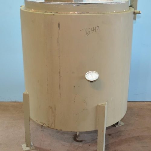 350 Gallon (Approx) S/S Vertical Jacketed Agitated Tank. 48 in Diameter x 51 in Straight Side. S/S Interior, Painted C/S Exterior. Oil Heated Jacket, No Pressure Rating, Electrically Heated Jacket with (2) Chromalox Model ARMTO-3455E2T2 Screw Plug Immersion Heaters. Flat Top, Flat Bottom. S/S Top Cover with 1/3 Hinged Lid. 12 in x 12 in Top Square Opening with Lift Off Cover. 2 1/2 in and 3 in Diameter Threaded Top Inlets, 2 1/4 in Diameter Opening For Agitator Shaft. (2) 1 in Diameter Top Vents. 2 1/2 in Diameter Threaded Side Top Inlet. Top Entering Lightnin 1/3 HP Clamp-On Prop Style Agitator with 3-Blade Prop. 2 in Diameter Threaded CBO with Extension and Manual Valve, 14 in Discharge Height at Tank Bottom, 9 in Discharge Height at 1 1/2 in Diameter Outlet. (4) 31 in H C/S Legs, Side Mounted Analog Thermometer. 230 V, 1 Ph, 60 Hz.