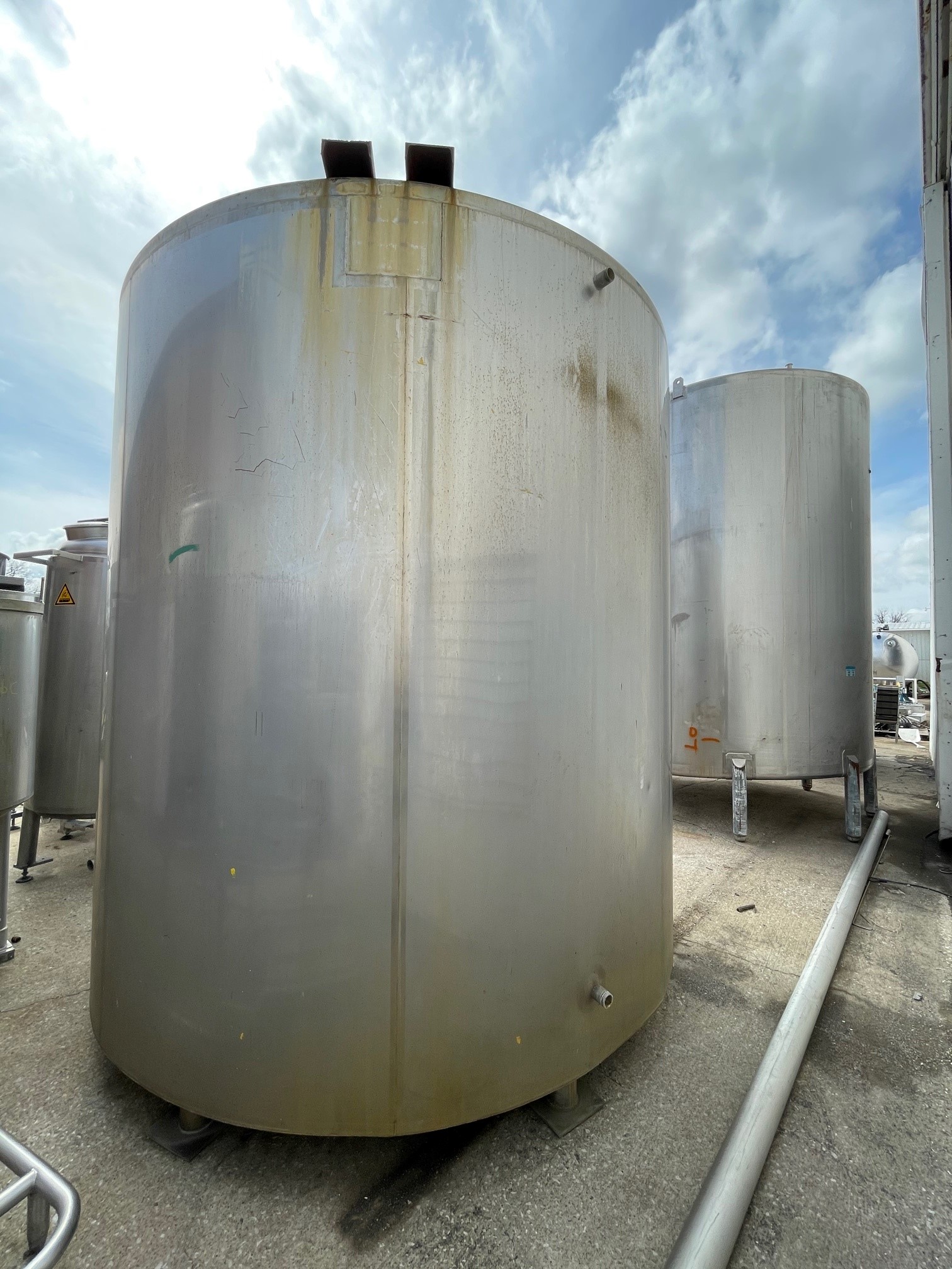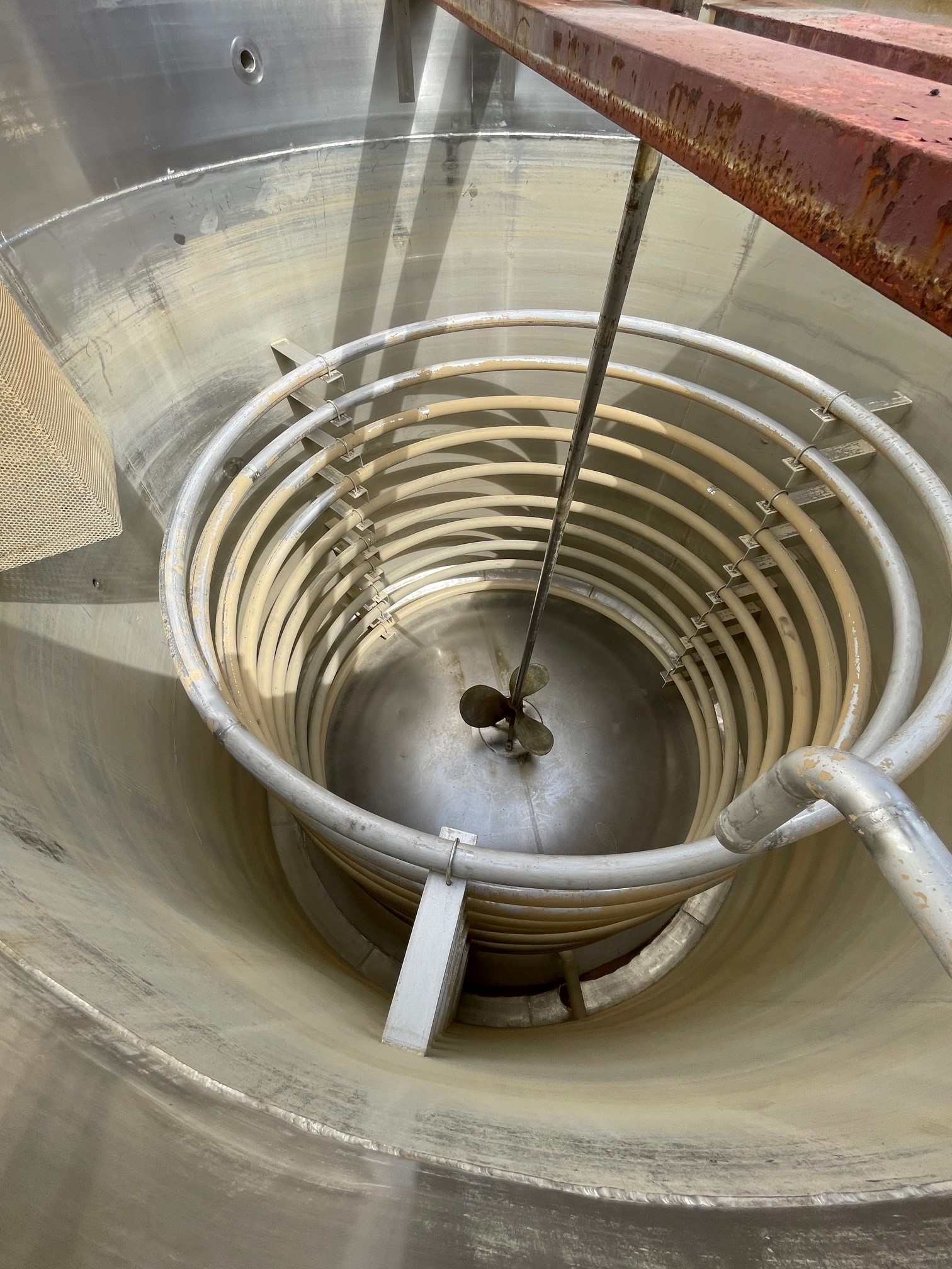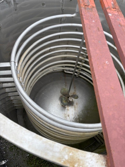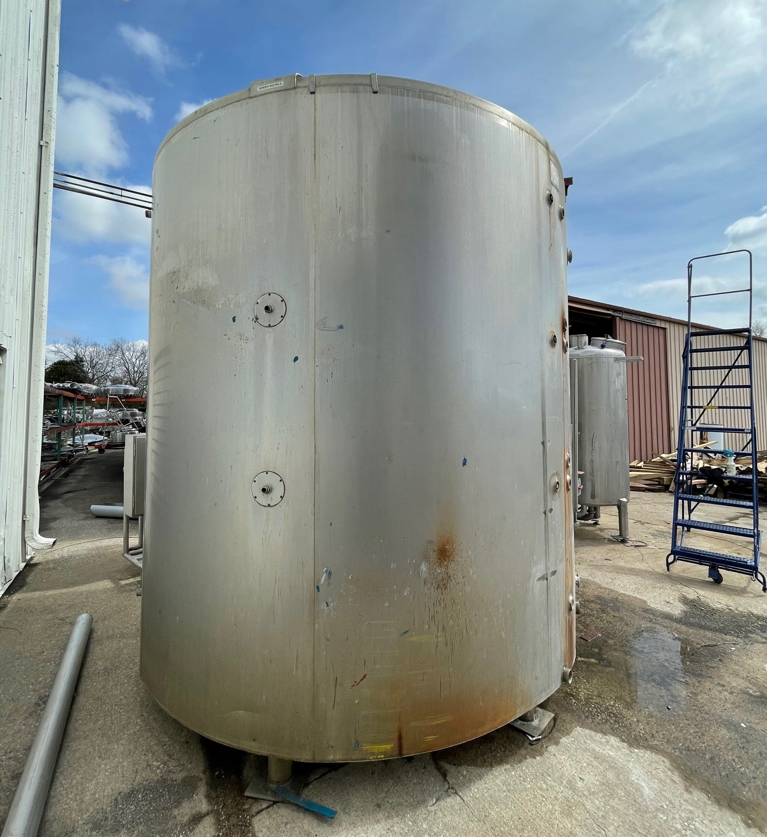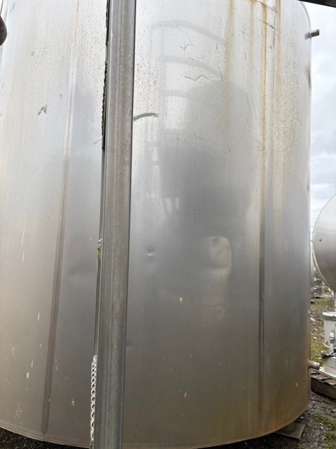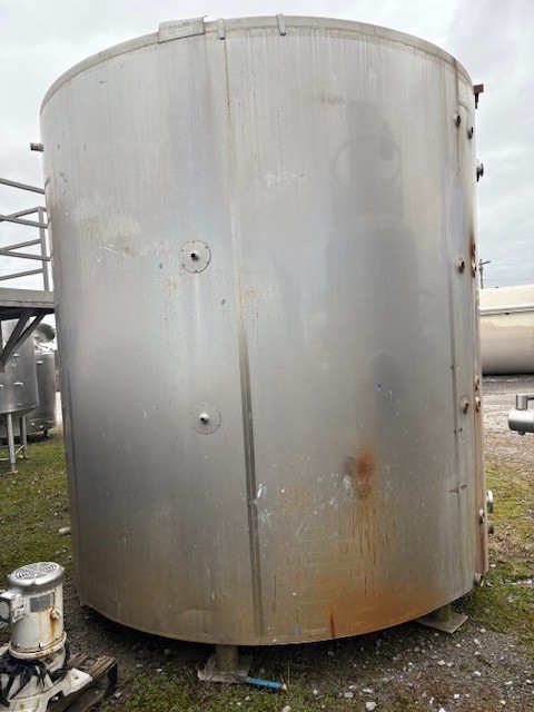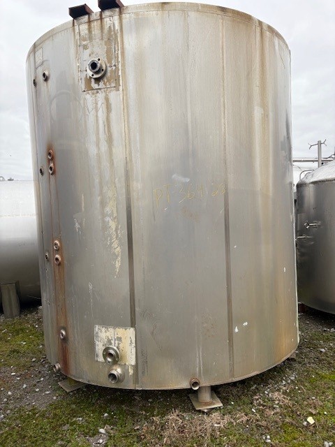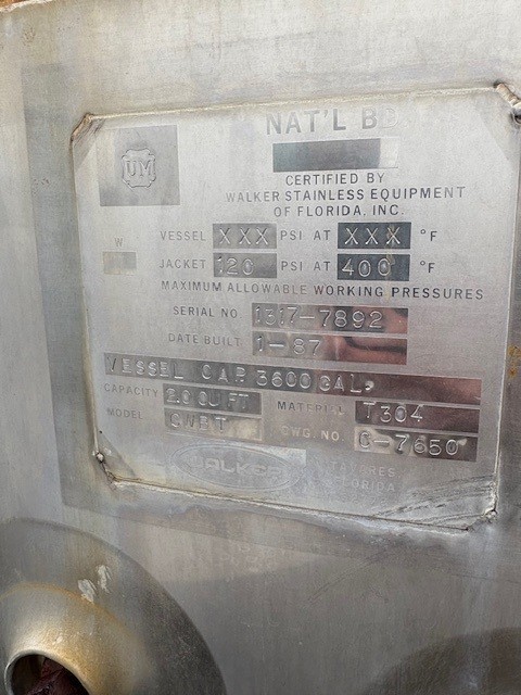 3,600 Walker Model CWBT Vertical S/S Jacketed Tank. Open Top, Reverse Dish Bottom, Pressure Wall, 24 in Vertical Prop Style Agitator. Internal Heat Exchange Coil, 3 in Discharge, Full Jacket, Jacket Rated 120 PSI at 400 Degrees F, 114 in Diameter x 139 in Height.