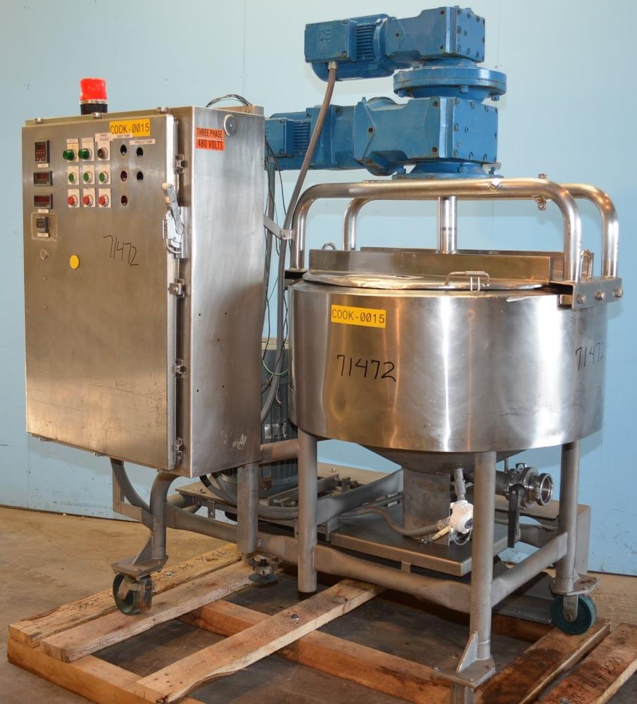 50 Gallon Breddo Model LORWWSS50 Jacketed 316 Stainless Steel Triple Motion Likwifier. Top Mounted Sweep Scrape and Prop Style Agitators with (4) Blade Prop with 10 in L Blades. 34 in ID, 16 in Straight Side, 23 in Deep, Maximum Working Pressure 125 PSI at 400 Degrees F, MDMT 0 Degrees F at 125 PSI, S/S Bridge, (2) 1/3 Hinged Covers, (2) 2 in Diameter Tri-Clamp Top Inlets, 3 in Diameter Bottom Outlet with Manual Butterfly Valve and 90 Degree Bend, Discharge Height 23 in, National Board Number 21869, 5 HP Agitator Drives, 25 HP Vari Speed Likwifier Drive, 1750 RPM, 28 Amps, With S/S Control Panel. 460 V, 3 Ph, 60 Hz. 56/28 Amps,