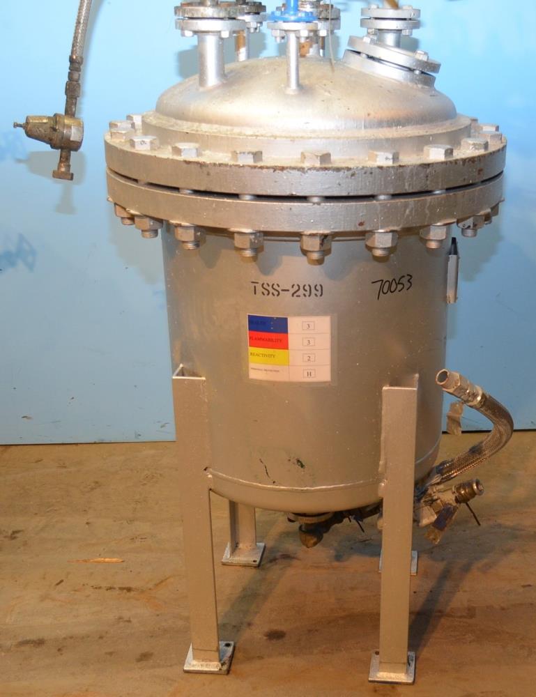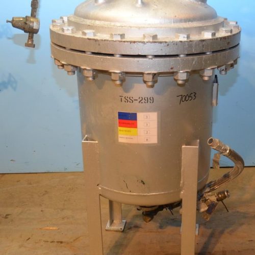 50 Gallon Chicago Boiler Company 304 S/S Vertical Pressure Tank. 24 in Diameter x 24 in straight side, dished bolt on top, dished bottom. Internal rated 14.7/122 PSI at 365 degrees F. Openings top (2) 1 in, 1-1/2 in, (3) 2 in. 2 in Center bottom outlet. Mounted on (4) carbon steel legs. National Board# 7664.
