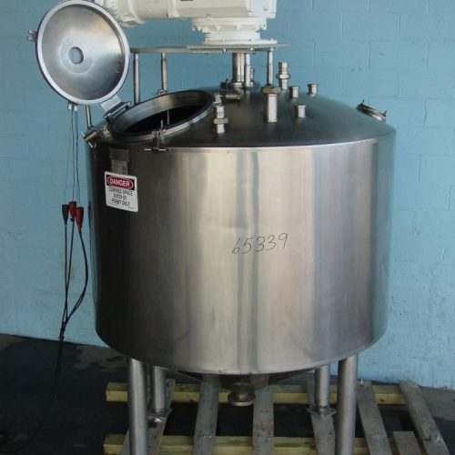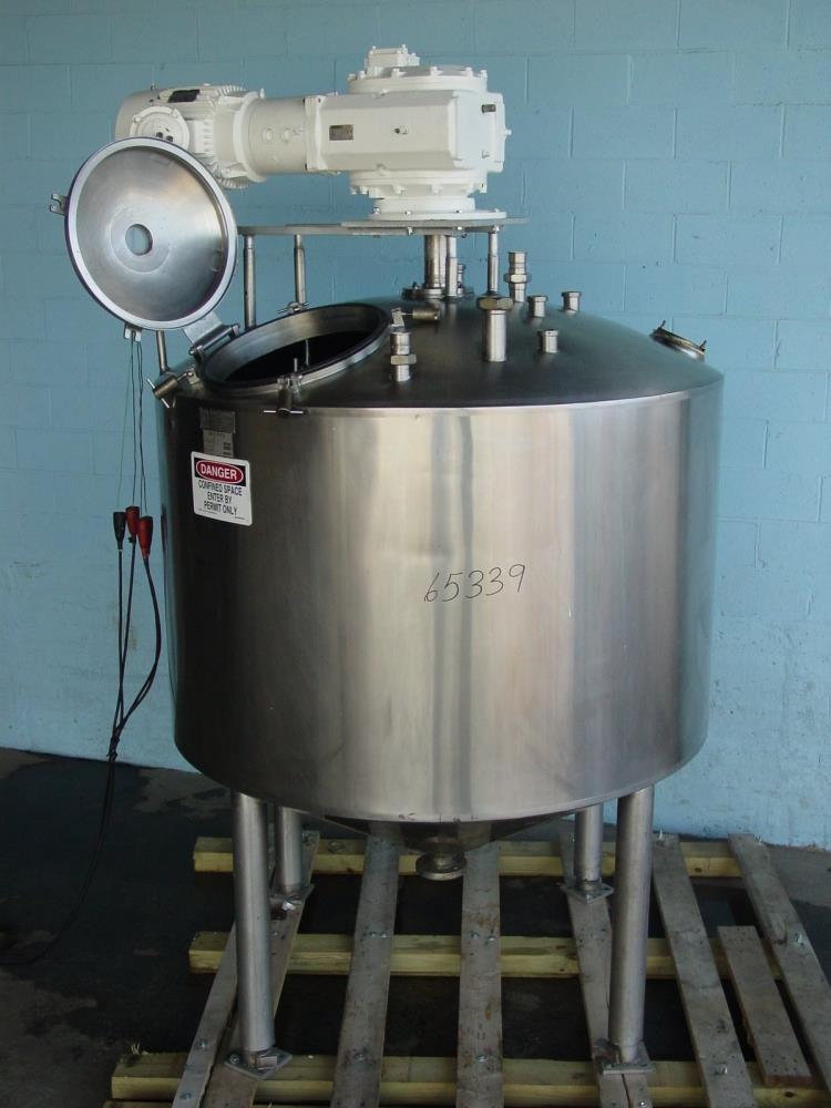 500 Gallon Cherry Burrell Model EPDCV 304S/S jacketed Scrape Agitated Vacuum cone processor, rated full vacuum internal with 10 PSI jacket with insulation and stainless steel external sheathing. Internal Dims: 66 in dia x 36 in straight side, 3 in (4) bolt flanges CBO, bottom thermowell port, Test pressure 22.5 PSIG. Max allowable vacuum 28 HG. Single motion scraper agitator w/scraper along the side walls only. 20in diameter manway with clamp down cover. 7 1/2 HP 3/60/230/460 top mounted agitaor drive, (2) 2in tri clamp top inlets, (4) 2in top inlets with sanitary threads, (2) 3in top inlets with sanitary threads, (1) 1in top inlet with sanitary threads, 15in discharge height. Mounted on (4) 37in tall legs with mounting pads.