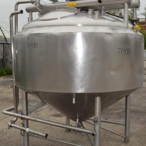 Approx 500 Gallon Crepaco Vertical S/S Jacketed Sweep Scrape Agitated Process Tank. Top Mounted S/S Sweep Scrape Agitator with Bottom Scrapers, (2) 9 in W x 28 in H Fixed S/S Baffles, 27 in Straight Side, 66 in ID, 61 in Deep, 12 in Deep Dome Top, 24 in Deep Cone Bottom, Maximum Working Pressure 75 PSIG. (3) 3 in Diameter, (2) 2 in Diameter, (1) 2.5 in Diameter Tri-Clamp Top Inlets. (1) 3 in Diameter Threaded Top Inlet. 18 in Diameter Top Manway with Hinged Cover. 3 in Diameter Tri-Clamp CBO with S/S Diverter Piping. 15 in Discharge Height (9.5 in Discharge Height with Piping Attached). (4) 38 in H S/S Legs. 5 HP TEFC Drive, 230/460 V, 3 Ph, 60 Hz, 1680 RPM, 13.6/6.8 Amp.