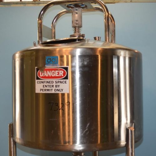 500 Gallon DCI Vertical 304 S/S Single Wall Sweep Agitated Dish Top, Cone Bottom Tank. Top Mounted Sweep Agitator, (2) Side Mounted 4 1/2 W by 30 in L Internal Baffles, (2) Bottom Mounted 4 1/2 W by 22 in L Internal Baffles, (1) Top Mounted Adjustable 24 in L by 6 in W Internal Baffle, 10 in Deep Cone Bottom with (1) 3 in Diameter Tri-Clamp Outlet, 24 in Discharge Height, 7 in Deep Closed Dome Top with 18 in Manway, 61.5 in Inside Diameter, 36 in Straight Side, (1) 3 in Tri-Clamp Top Inlet, (1) 2 in Tri-Clamp Top Inlet, (1) 3 in Vent, (3) 40 1/2 in H S/S Pipe Legs, Temperature Probe, 230/460 V (wired 460 V), 3 Ph, 60 Hz, 1700 RPM, Gear Box Ratio 20.