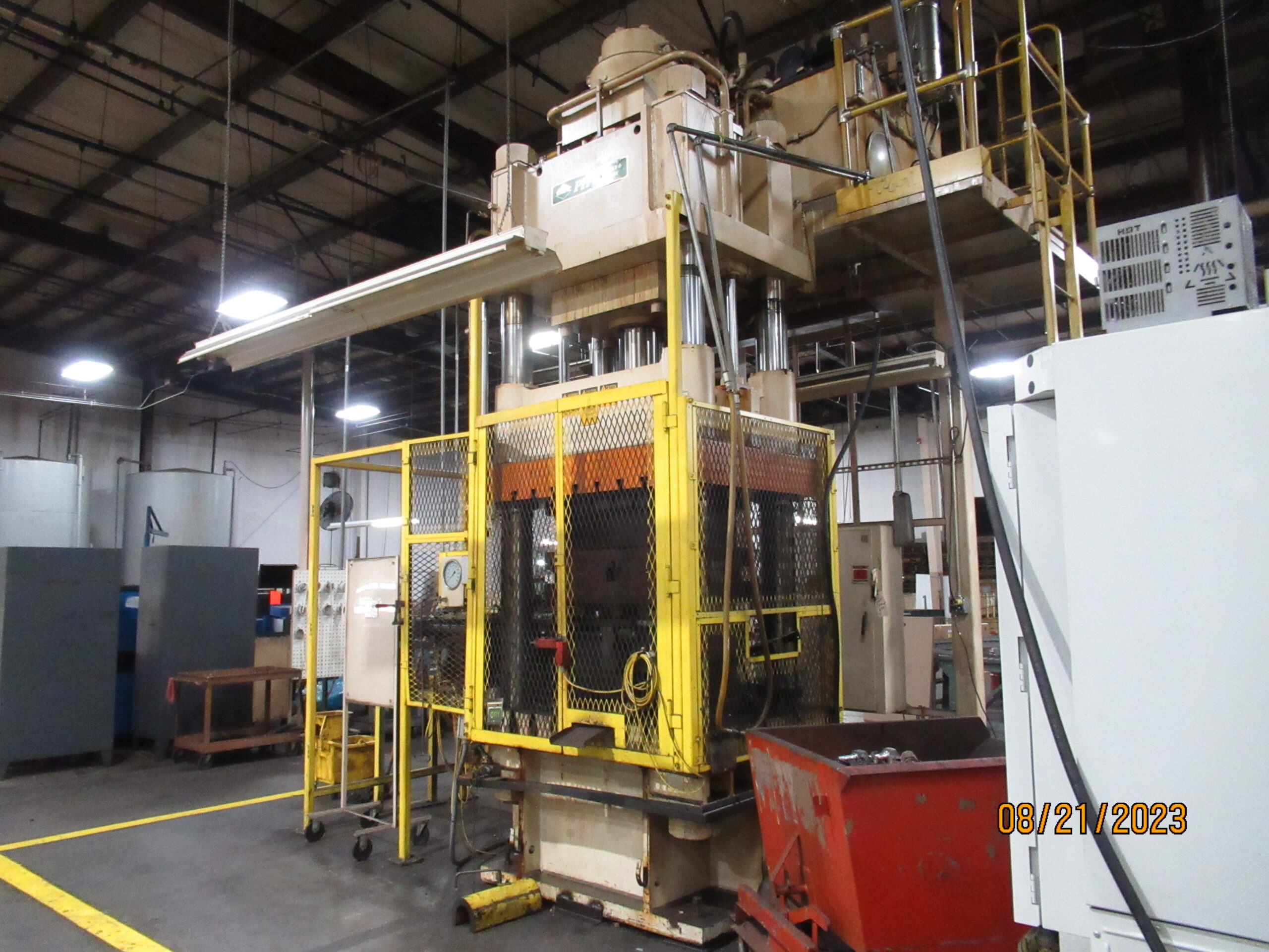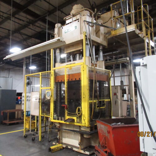500 Ton 4-Post Hydraulic Press with 60″ X 48″ T-Slotted Bed, 40″ X 20″ Between Posts, 32″ Stroke, 40″ Daylight, Self-Contained Hydraulic Power Supply, Advantage Chilling Unit, Side Push Feed, Allen Bradley Panelview 300 Programmable Logic Control