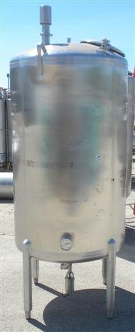 Cherry Burrell Tank, 600 Gallon, 316L Stainless Steel, Vertical. 48in Diameter x 72in straight side, dish top and bottom. Internal CIP spray ball. Top openings: 18in manway with cover, 3in sanitary, (3) 2in sanitary, 1 1/2in sanitary. 4in sanitary center bottom outlet. Mounted on 4 adjustable stainless steel legs. Approximate 19in discharge height.
