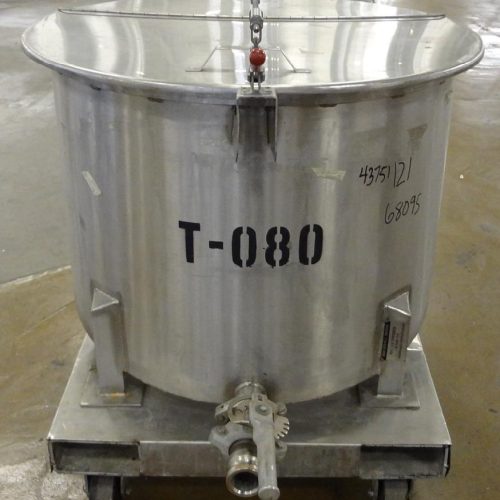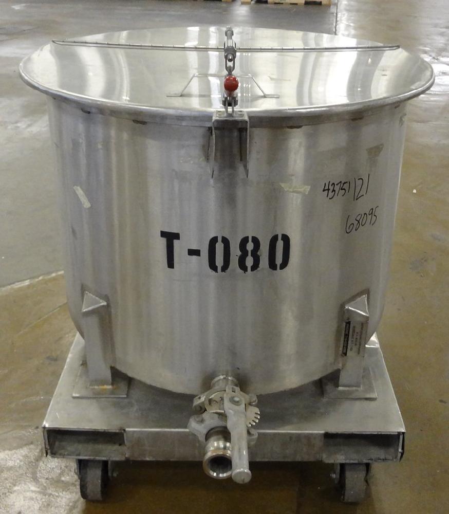 60 Gallon Water Cooling Corporation Vertical S/S Single Wall Tank, Approximate 30-1/2 in diameter x 21 in straight side. Flat top with a bolt on hinged cover, 6 in sloped bottom. 2 in Tri-clamp side bottom outlet. Mounted on 4 stainless steel legs on a carbon steel, and stainless steel forklift base with casters.