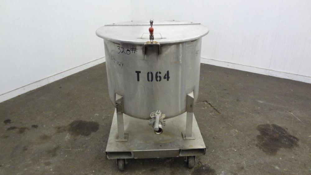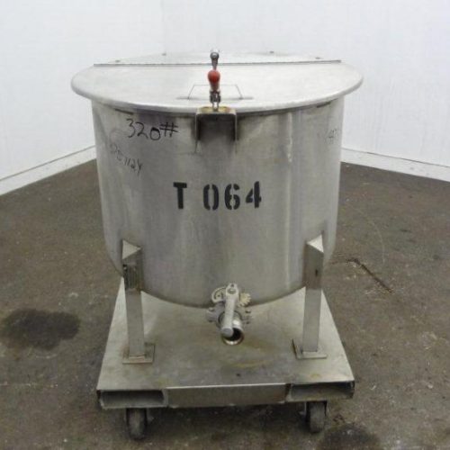 60 Gallon Water Cooling Corporation Vertical S/S Single Wall Tank, Approximate 30-1/2 in diameter x 21 in straight side. Flat top with a bolt on hinged cover, 6 in sloped bottom. 2 in Tri-clamp side bottom outlet. Mounted on 4 stainless steel legs on a carbon steel, and stainless steel forklift base with casters.