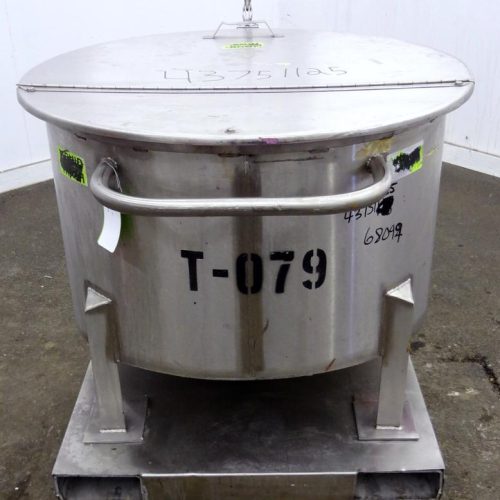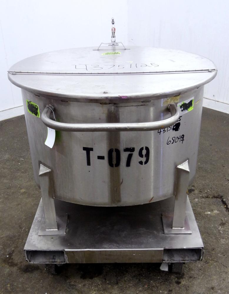 60 Gallon Water Cooling Corporation Vertical S/S Single Wall Tank, Approximate 30-1/2 in diameter x 21 in straight side. Flat top with a bolt on hinged cover, 6 in sloped bottom. 2 in Tri-clamp side bottom outlet. Mounted on 4 stainless steel legs on a carbon steel, and stainless steel forklift base with casters.