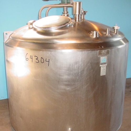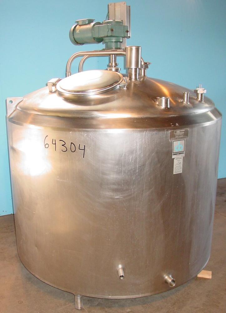 600 gal Cherry Burrell 100psi jacketed, Turbine agitated, sloped bottom, Domed Top Tank, 316 S/S, NB #3412, 100 psi @ 350 deg f -20 @ 100 psi multiple zone jacket, Inside Dims: 66in dia x 42in st side, Dual CIP Spray Balls, Internal baffle, 18in top manway w/ hindged cover, (1) 3In (1) 1 1/2 in top tri clamp style openings, 2in side bottom tri clamp outlet, Side bottom probe port, (4) 8 in L pipe legs, 12 in discharge Ht, Electrical: 1 hp 3/460/60 agitator drive