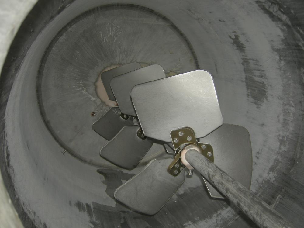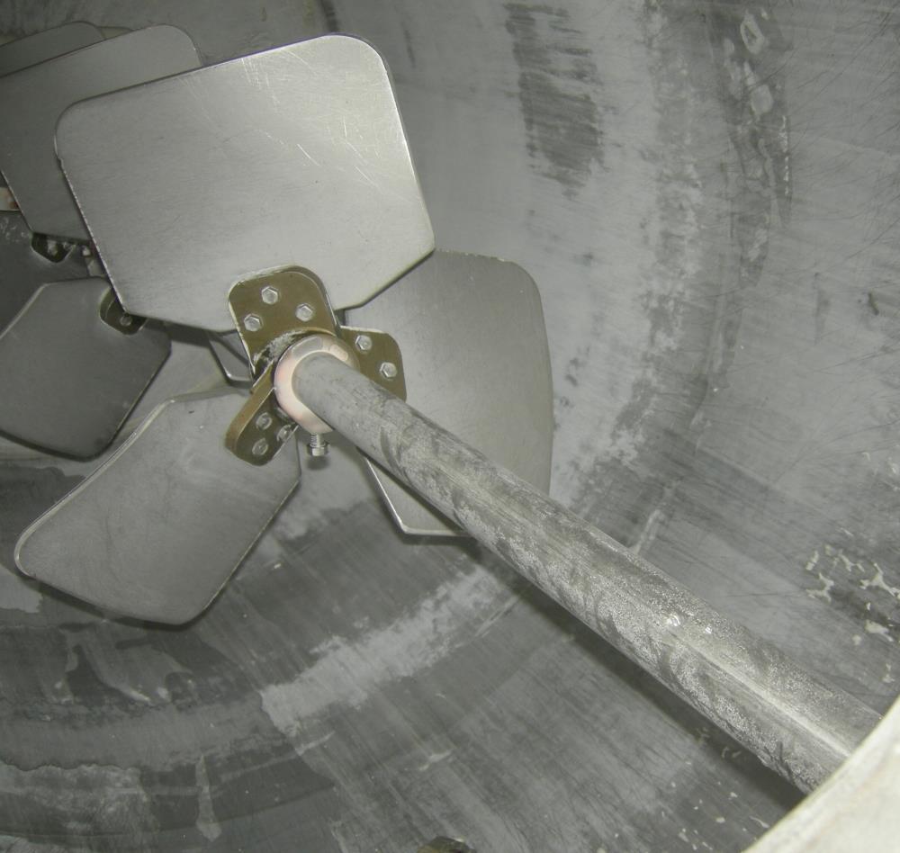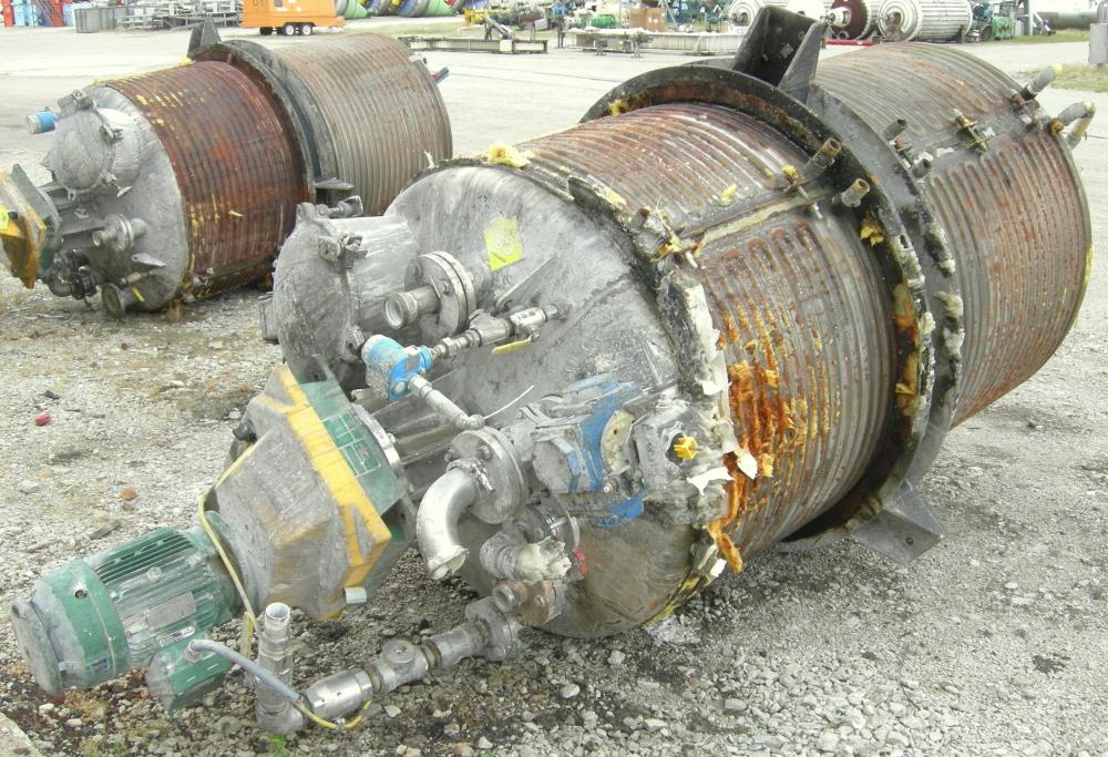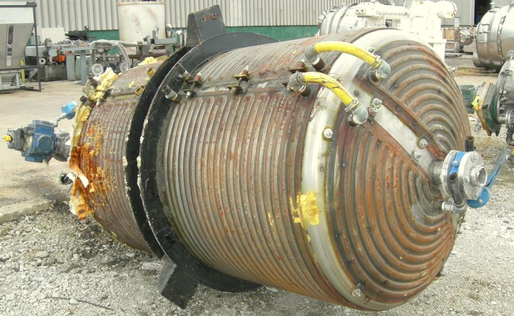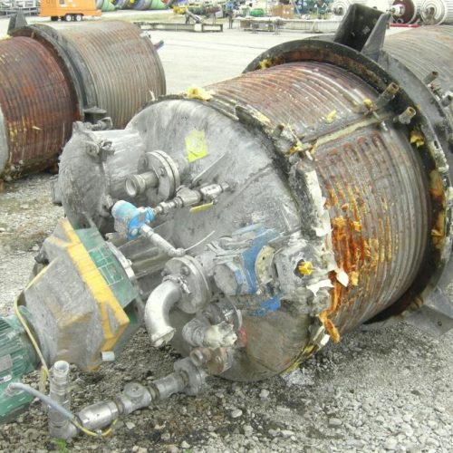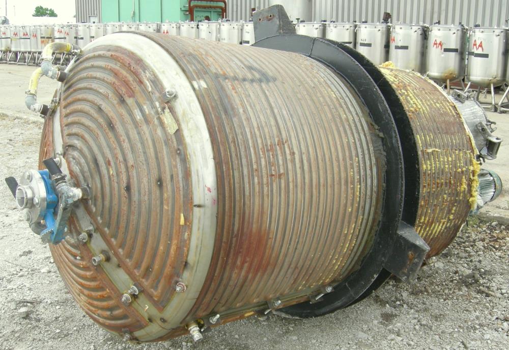 600 Gal Mueller 304 S/S dish head turbine agitated Jacketed Tank, Vertical. 48 in dia x 72 in straight side. Dish top and bottom. Bolt on panel jacket. Lightnin Agitator model 15 S 5, 2 in dia 316 stainless steel shaft with (3) bolt on 3 blade turbines, driven by a 5 HP, 3/60/230/460 volt, 1160 RPM XP motor, ratio 14.06:1, 82.0 output RPM. Top Openings: 16 in manway with cover, 12 in drive, (3) 3 1/2 in flange, (2) 1 1/2 in NPT, (2) 2in flange. 3 in center bottom outlet. Mounted on side lug mounts.